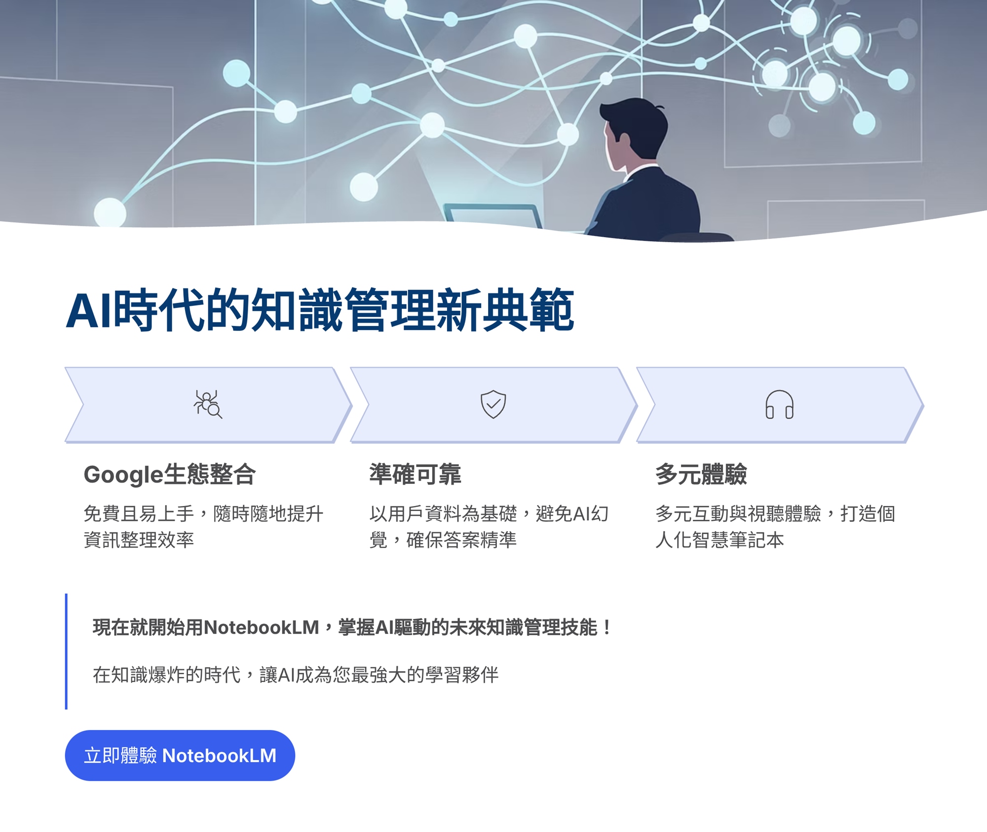 1月10日(六)20:00 一箭雙雕AI線上說明會分享主題:「NotebookLM:AI時代必備的知識管理技能」
