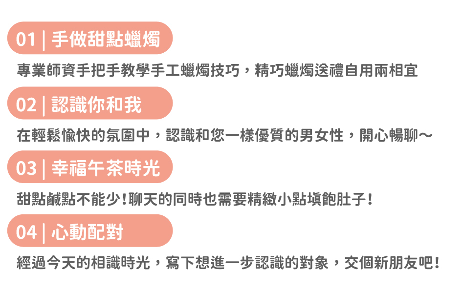 🌞活動費用包含:優質男女事先篩選、半日活動、下午茶甜點飲料、手作蠟燭蠟燭課程、活動主持、活動場地、配對成功有機會獲得配對小禮物如雙人電影票或下午茶劵等