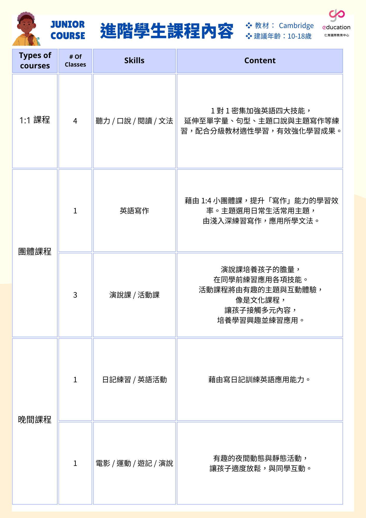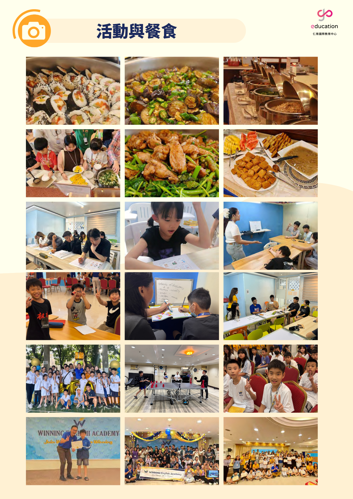 教材採用劍橋授權教材與 GoGo Banjo 互動美語教材,配合講究的課程與學習法設計,兒童課程強調「高互動」、「遊戲同樂」,配合具學習目的的課外活動,Winning 暑假英語營是家長放心、孩子開心的最佳選擇。
