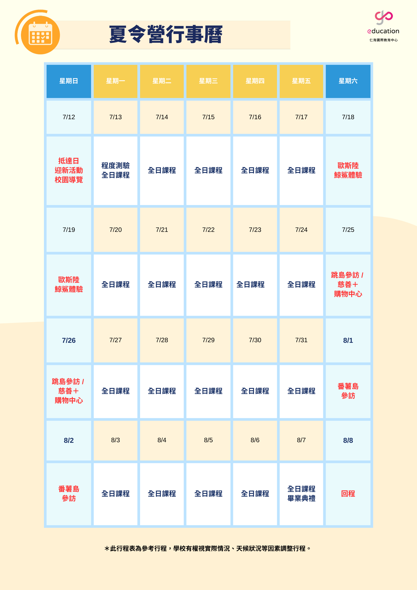 - 本夏令營報名費用包含:完整詳細費用可於報名後洽詢顧問。不包含:新辦護照費用、個人當地零用花費、個人醫療保險等個人費用。