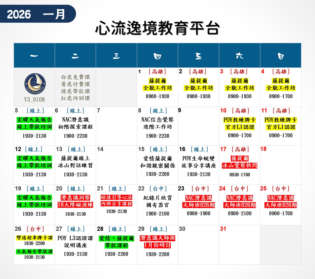 每週於台北、台中及高雄等城市巡迴開課