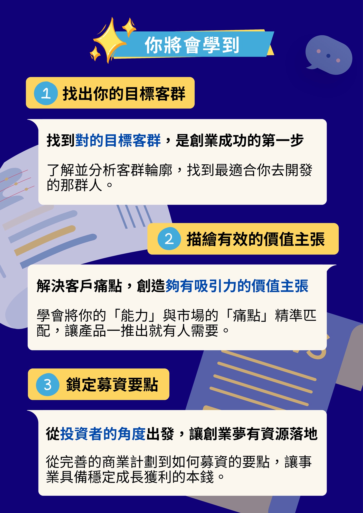 從「投資者的角度」出發,檢視你的商業計劃。從完善的商業架構到募資簡報的要點,讓你的創業夢想有資源落地,具備穩定成長獲利的本錢。