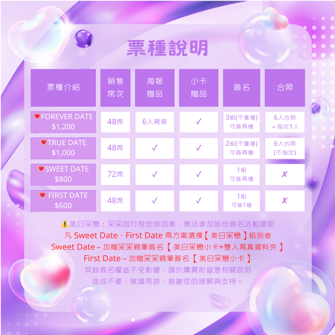 - 每位女孩可簽名之商品數量,依方案別說明提供號碼牌。