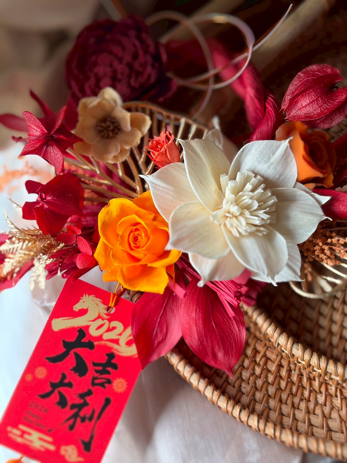 在承載著春天的永生與索拉花(Sola Flower)中, 以透金輕奢葉材佐以注連繩的祝願,搭配法式香氛 𝑴𝑨𝑻𝑰𝑬𝑹𝑬 𝑷𝑹𝑬𝑴𝑰𝑬𝑹𝑬,讓春天的氣息隨之綻放,結起新年的美好序幕。