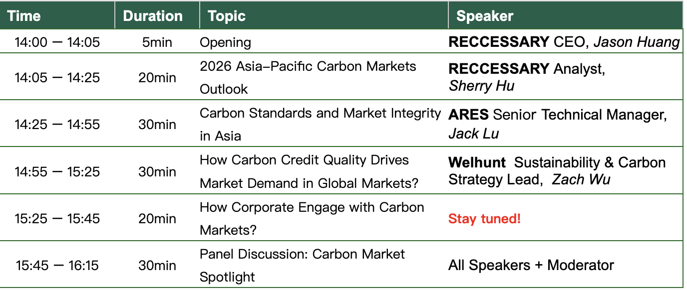 Against the backdrop of accelerating global carbon pricing mechanisms and the rapid evolution of carbon markets across Asia-Pacific nations, this event centers on a 2025 review and 2026 outlook. Combining the latest market observations, it provides an in-depth analysis of key institutional developments and market dynamics in representative Asia-Pacific markets. The event convenes experts from various market sectors to examine policy, markets, and corporate practices from multiple perspectives, helping businesses and investors grasp the key trends and strategic directions shaping the future of Asia-Pacific carbon markets.