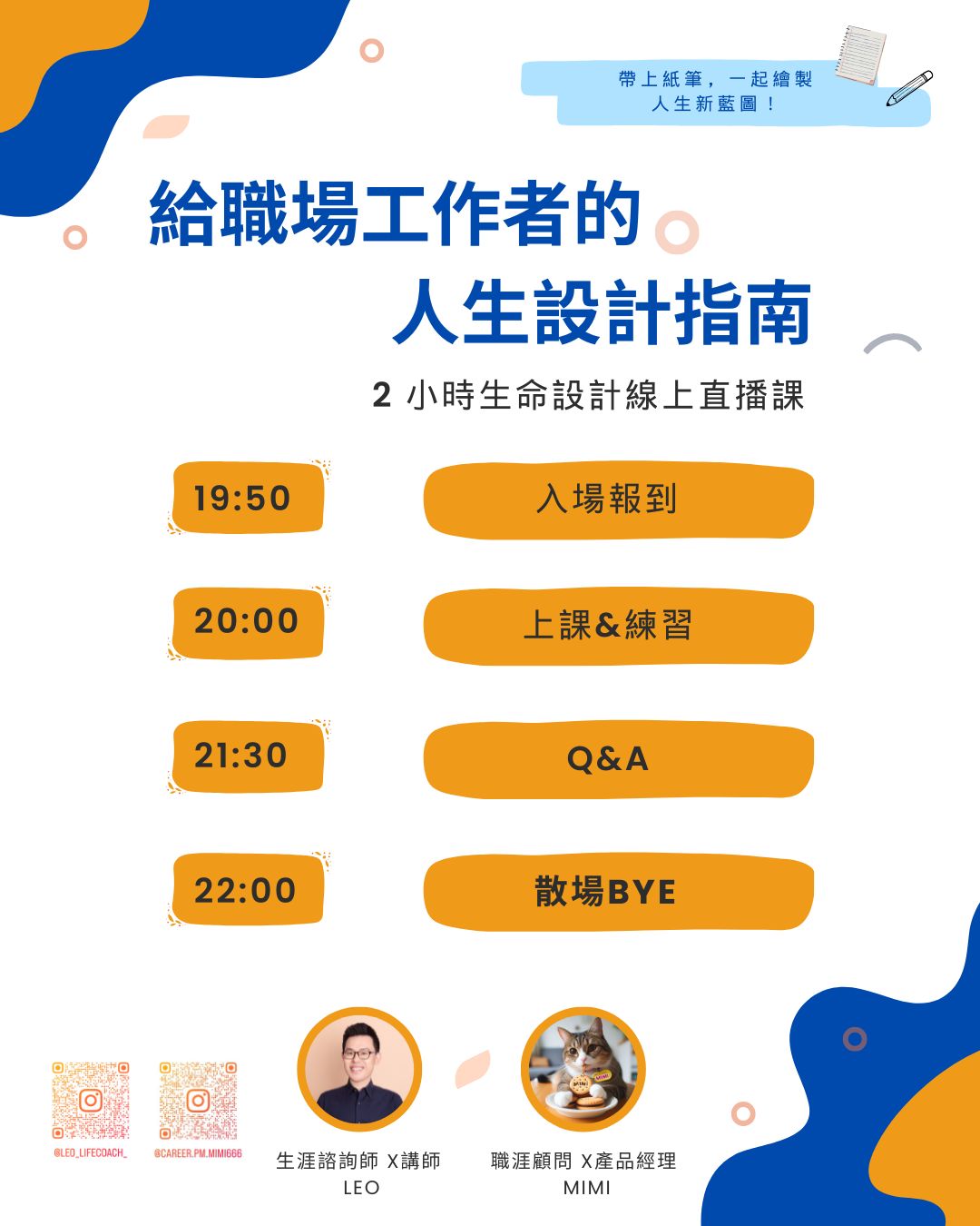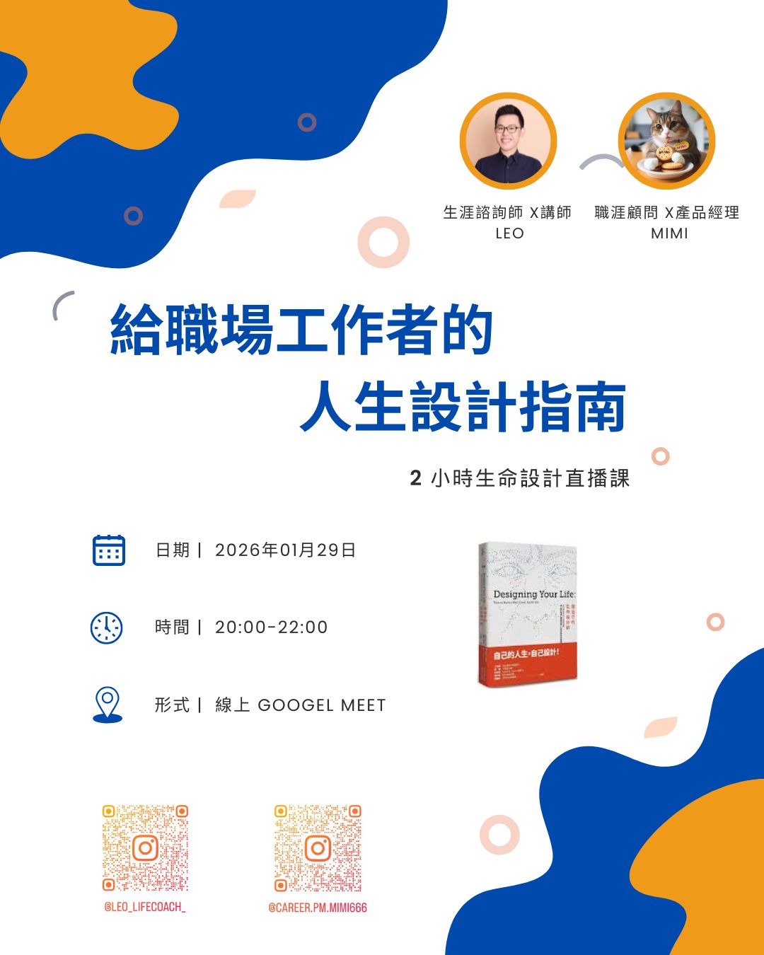 【給職場工作者的人生設計指南】2 小時生命設計線上直播課,是由 生涯諮詢師 Leo 與 產品經理 Mimi 共同設計的微型線上課程。