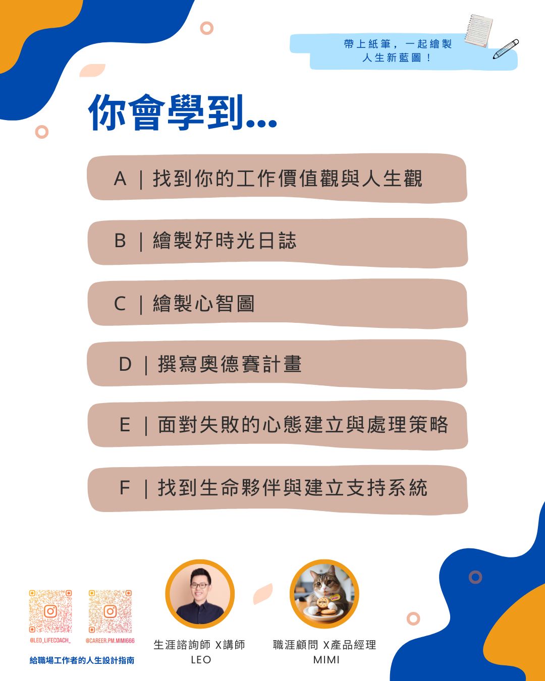 5.本課程為模組化教學,不提供個人諮詢服務。若有需個人生涯諮詢服務,請於line官方帳號,與Leo或Mimi預約。