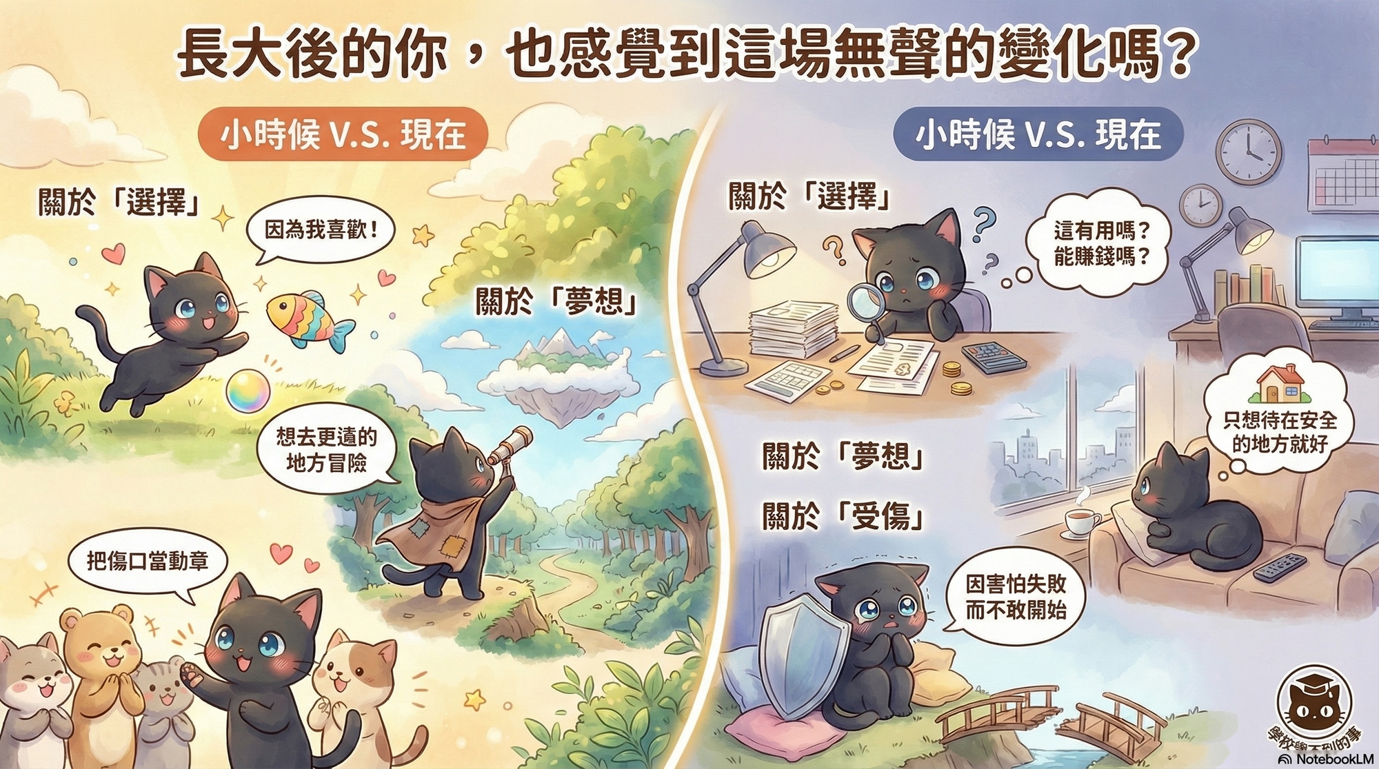 - 現在的你: 理由變得好複雜——「這對履歷有用嗎?」、「這能賺錢嗎?」、「這會不會浪費時間?」。我們變得好精明,卻再也捨不得純粹地投入一次。