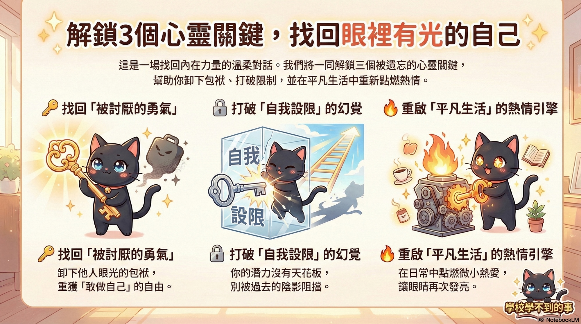 🔑 關鍵一:找回「被討厭的勇氣」 為什麼我們越長大越顧慮別人的眼光? 其實,那份「不怕」的特質一直都在。我們將帶你看懂,是什麼讓你變得小心翼翼?並且學會卸下那些不屬於你的包袱,重新找回「敢做自己」的自由。