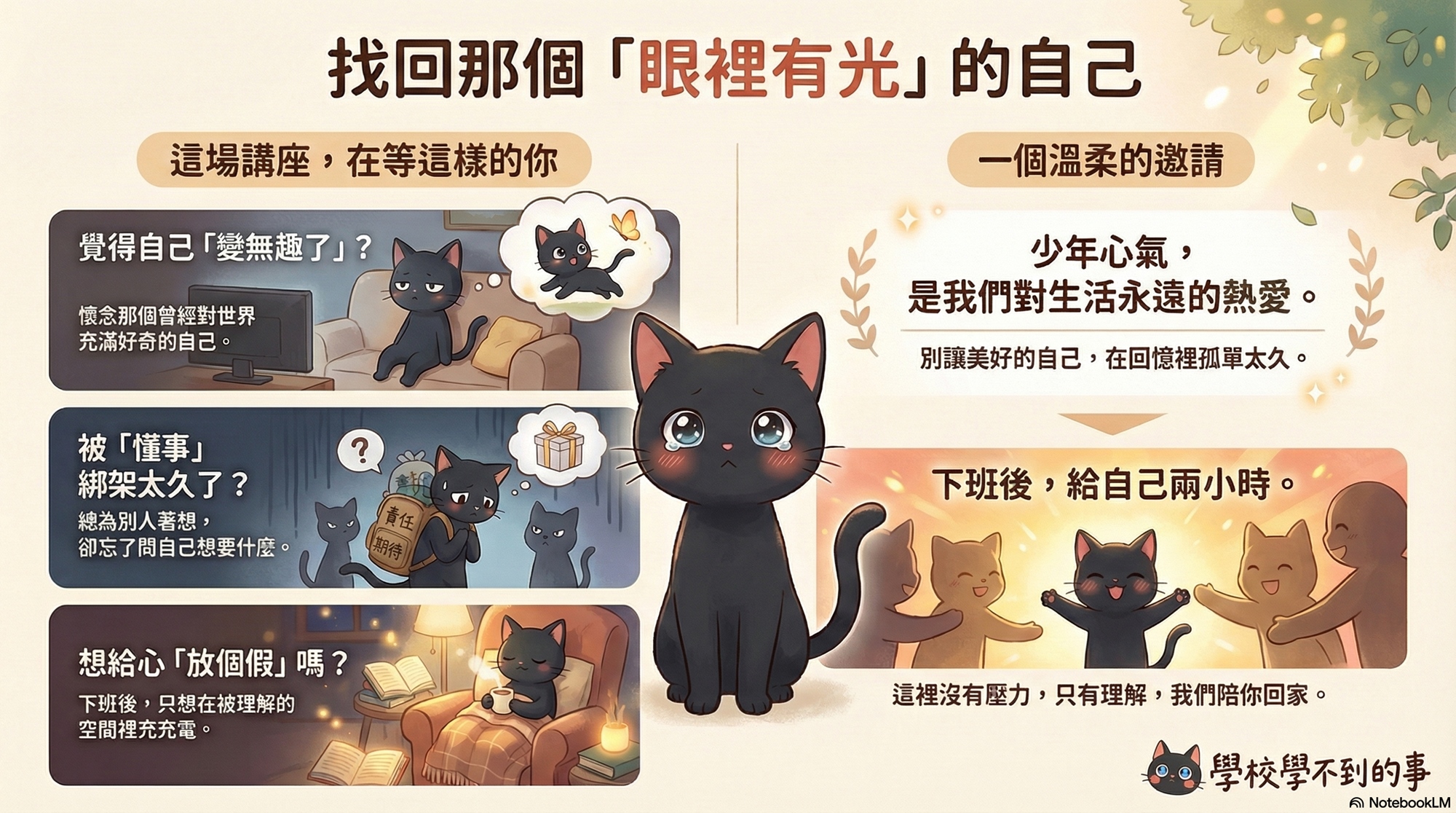 (結尾溫柔召喚) 少年心氣不是青春期的限定品,它是我們對生活永遠的熱愛。 別讓那個美好的自己,在回憶裡孤單太久。 下班後,給自己兩小時。這裡沒有壓力,只有理解。我們一起把那個「眼裡有光」的自己,接回家。