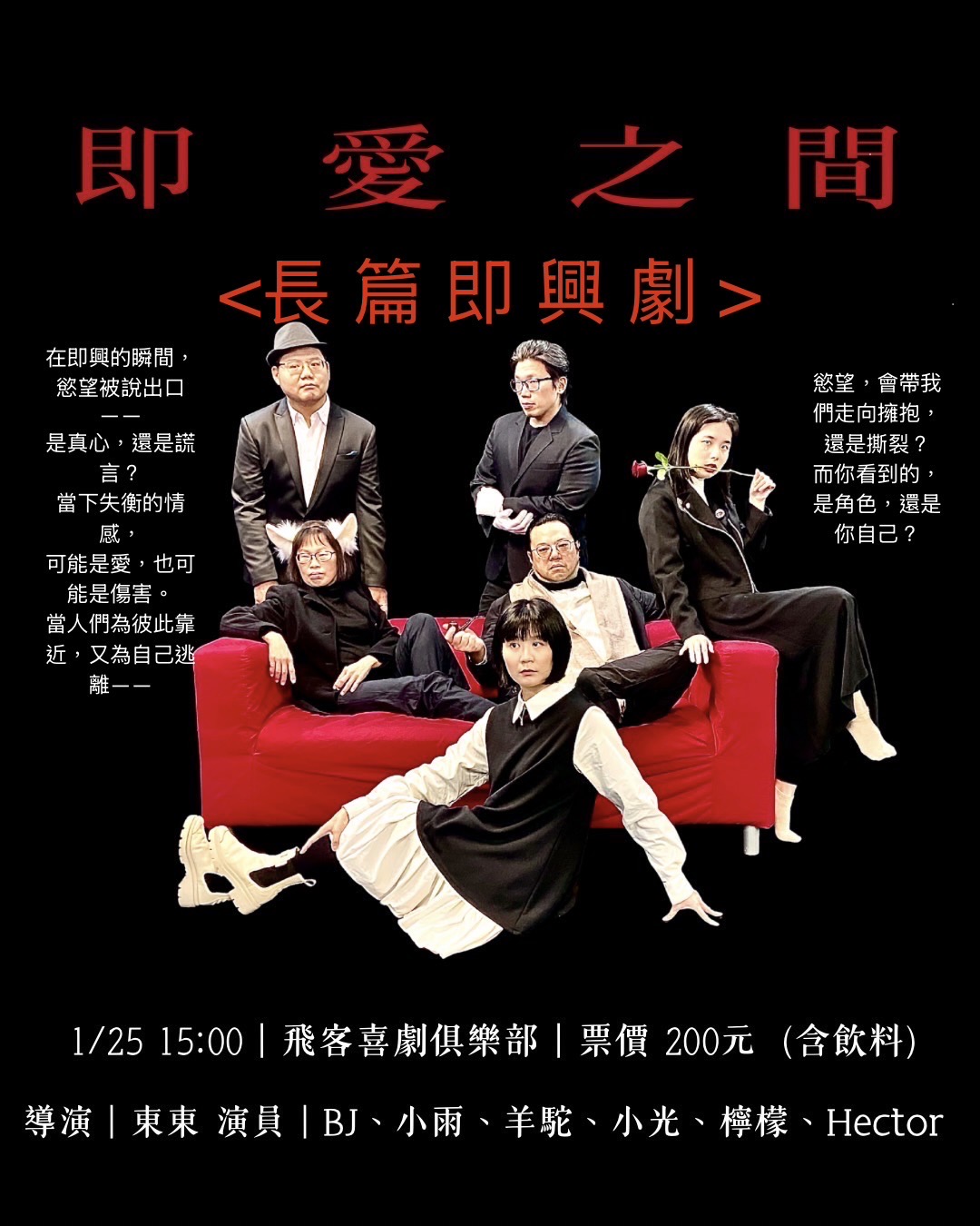 飛客俱樂部一月份特邀多位即興演員,舉辦《長篇即興劇:即愛之間》機會難得,懇請捧場! 一起來體會即興的奧妙~!不容錯過!