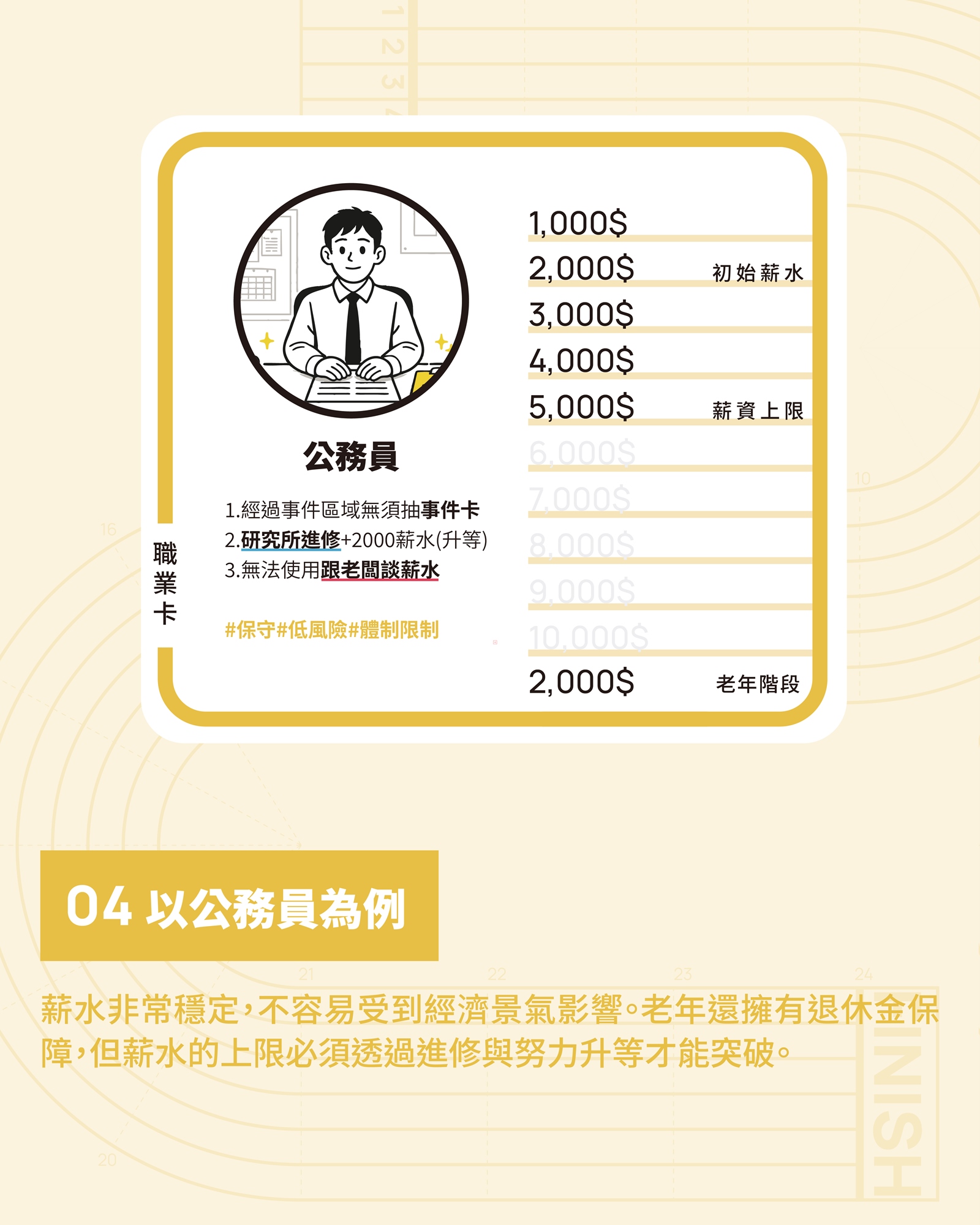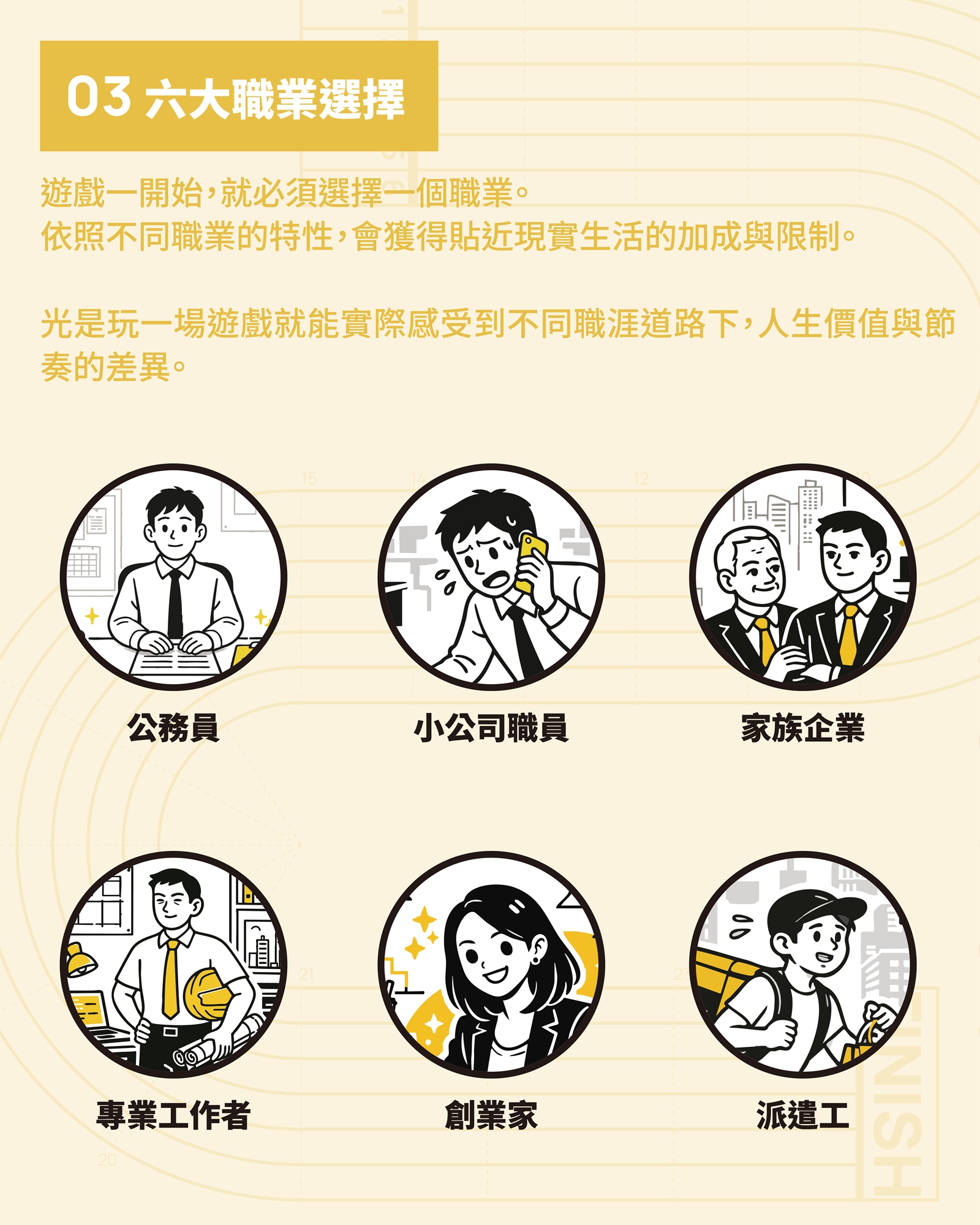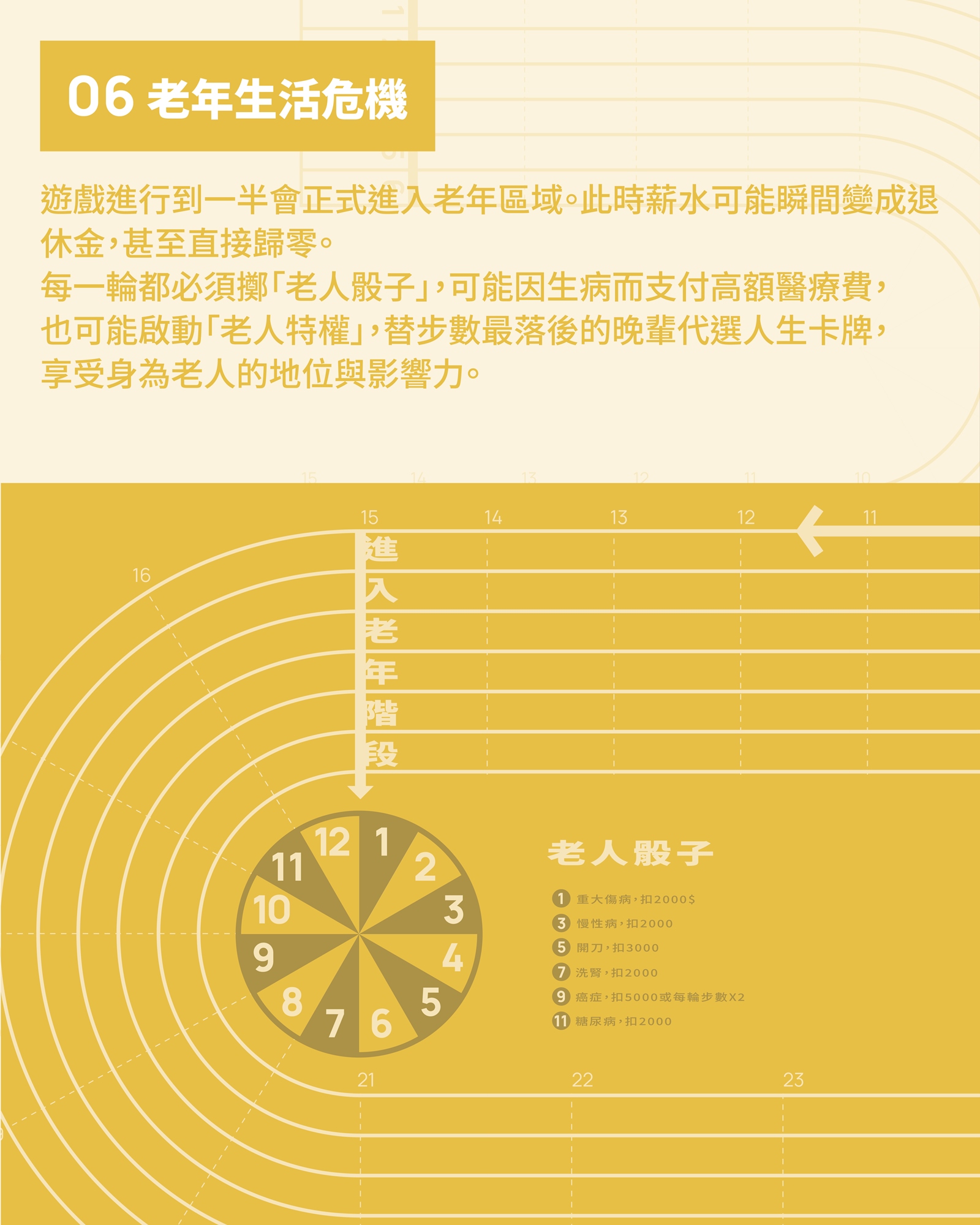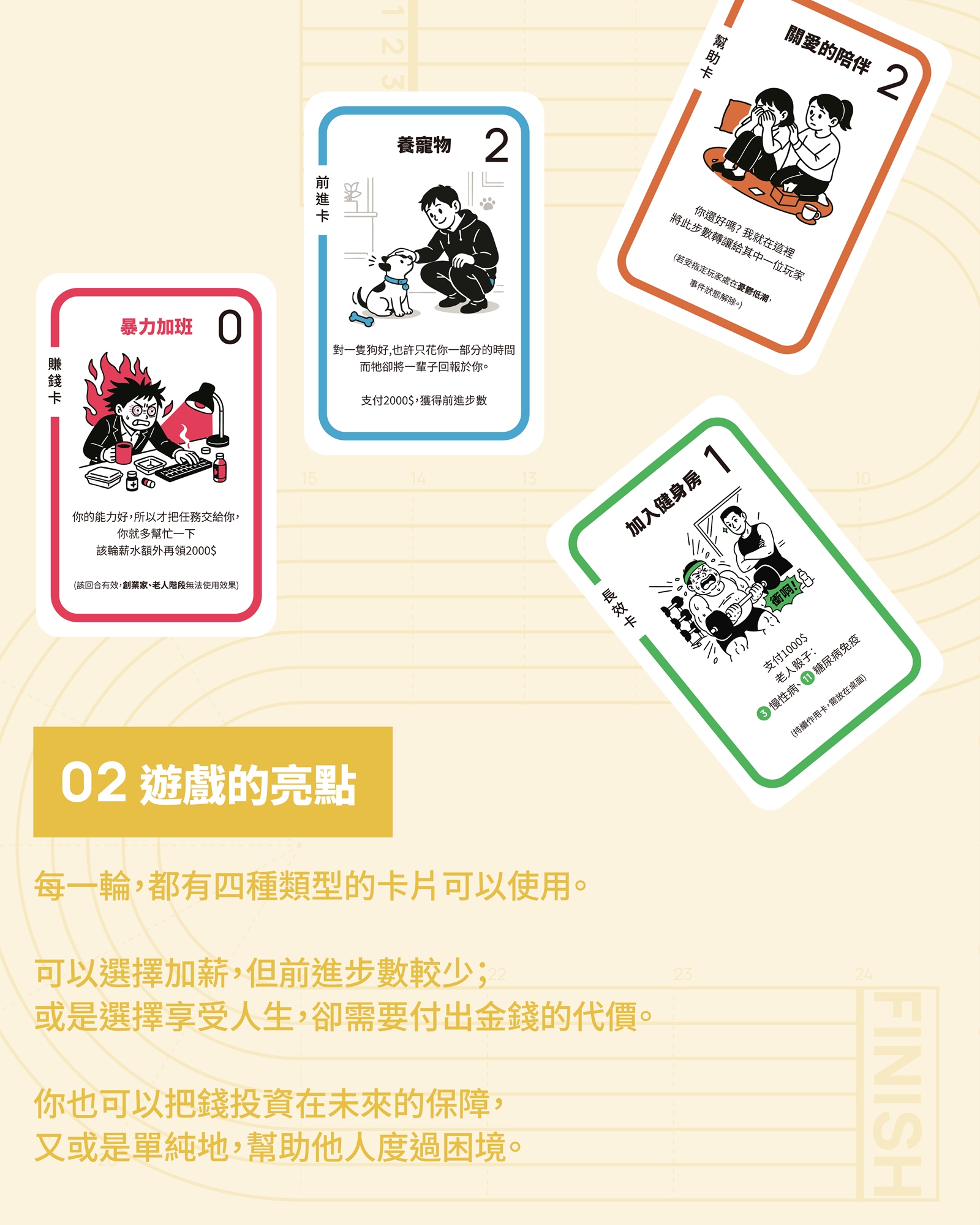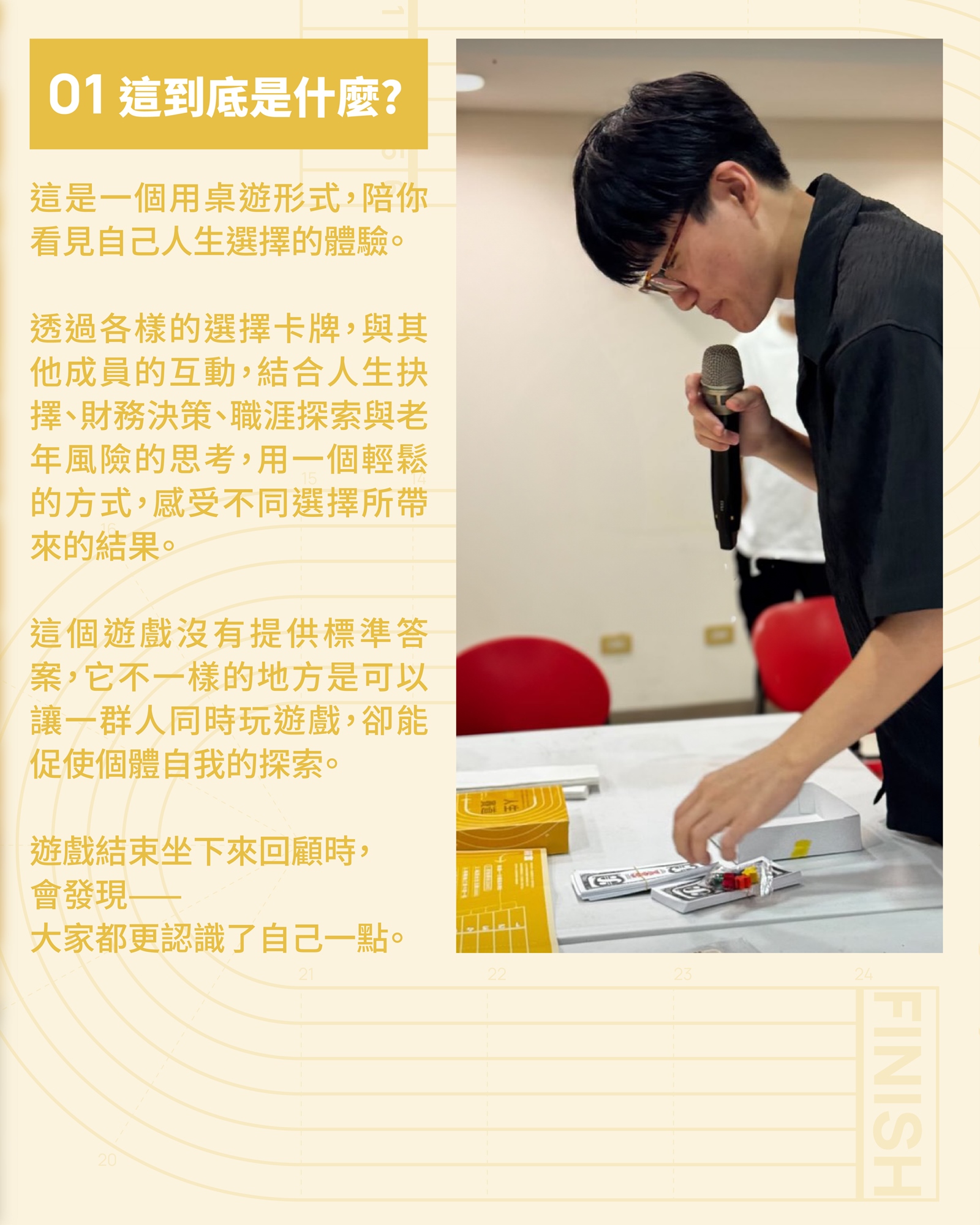 這是一個以桌遊形式,透過人生的各樣選擇卡牌以及與其他成員的互動,結合人生選擇、財務決策、職涯探索與老年風險思考,陪你用輕鬆的方式感受不同選擇帶來的結果。