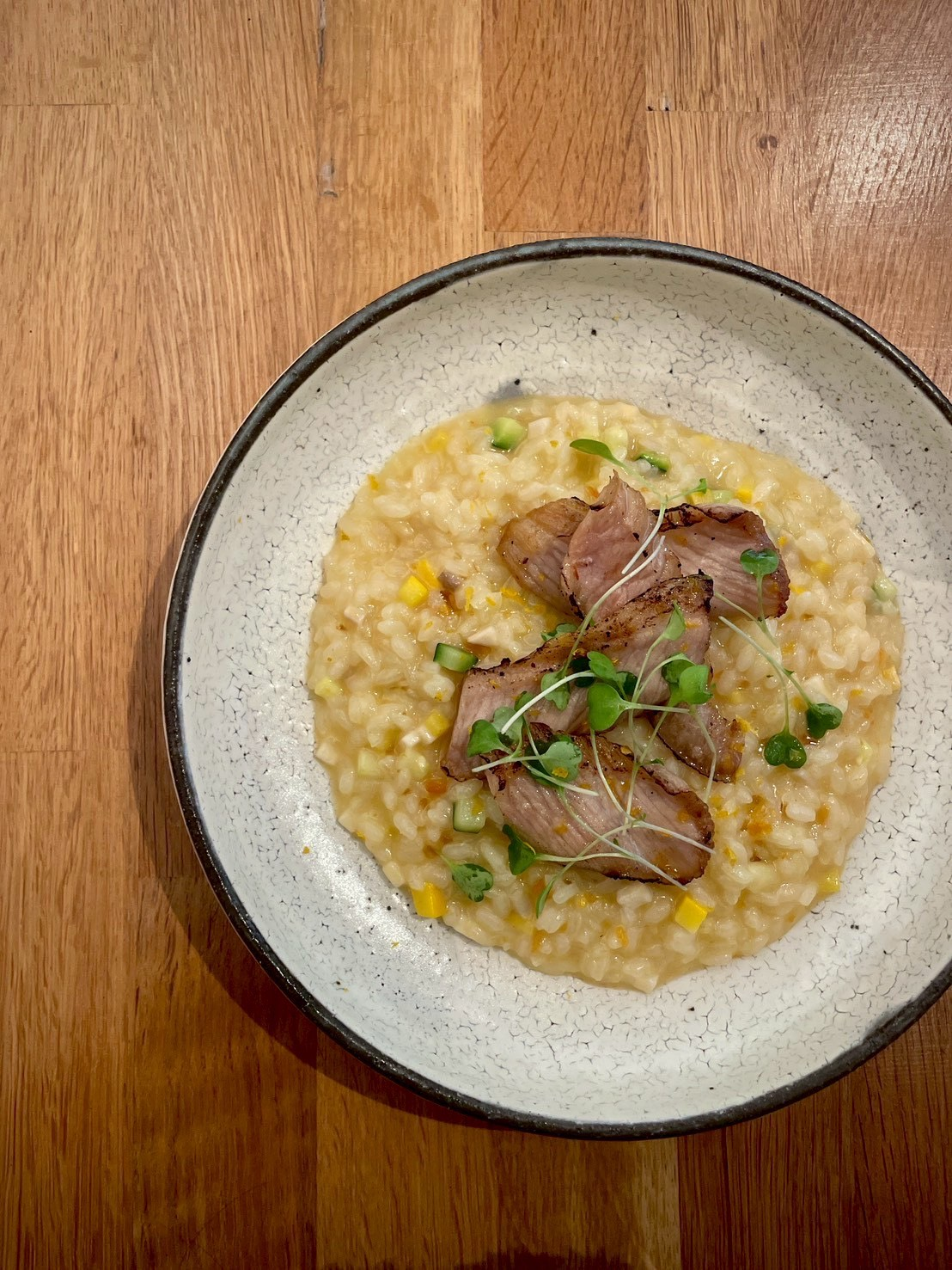 將台灣柑桔的明亮香氣融入米粒,燉煮出的飯粒晶亮、口感柔和而帶果香,酸甜之間有層次的微苦韻味,提升整體味覺的層次感。柑桔的清新與燉飯的溫潤相互映襯,將「大桔大利」的祝福化作餐桌上的香氣,讓每一口都充滿年節喜氣與島嶼土地的溫度,為新年的團圓盛宴增添一抹亮色。