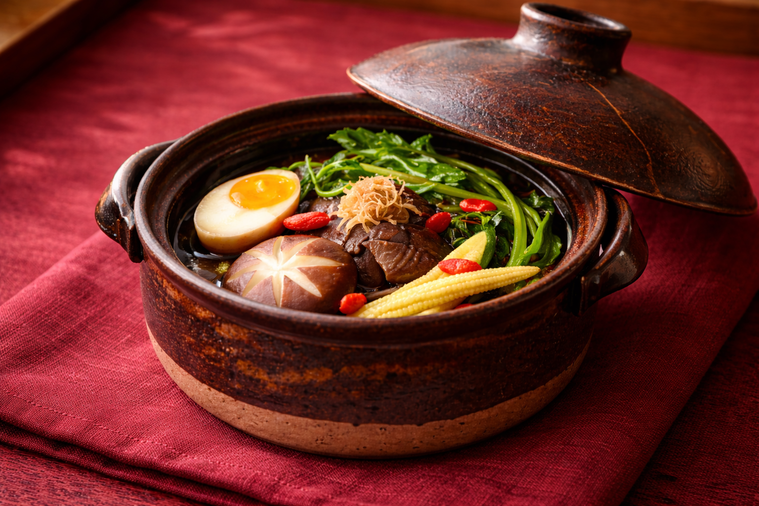 選用老母雞慢火熬煮,湯色澄澈卻滋味深厚,雞肉柔嫩,湯頭溫潤而不厚重。陶鍋保溫,讓熱度與香氣在餐桌上緩緩釋放,成為最具「團圓感」的一道料理。這鍋雞湯不只是滋養身體,更像是一份安定的存在,在寒涼時節裡,為年節餐桌注入踏實而溫暖的力量。