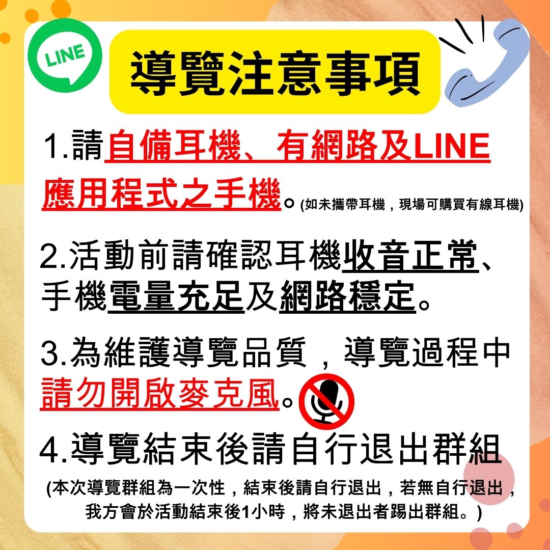 3.本活動為Line群組導覽,該導覽收音會因為訊號、網路以及其他人麥克風未完全關閉而有所影響,請留意!