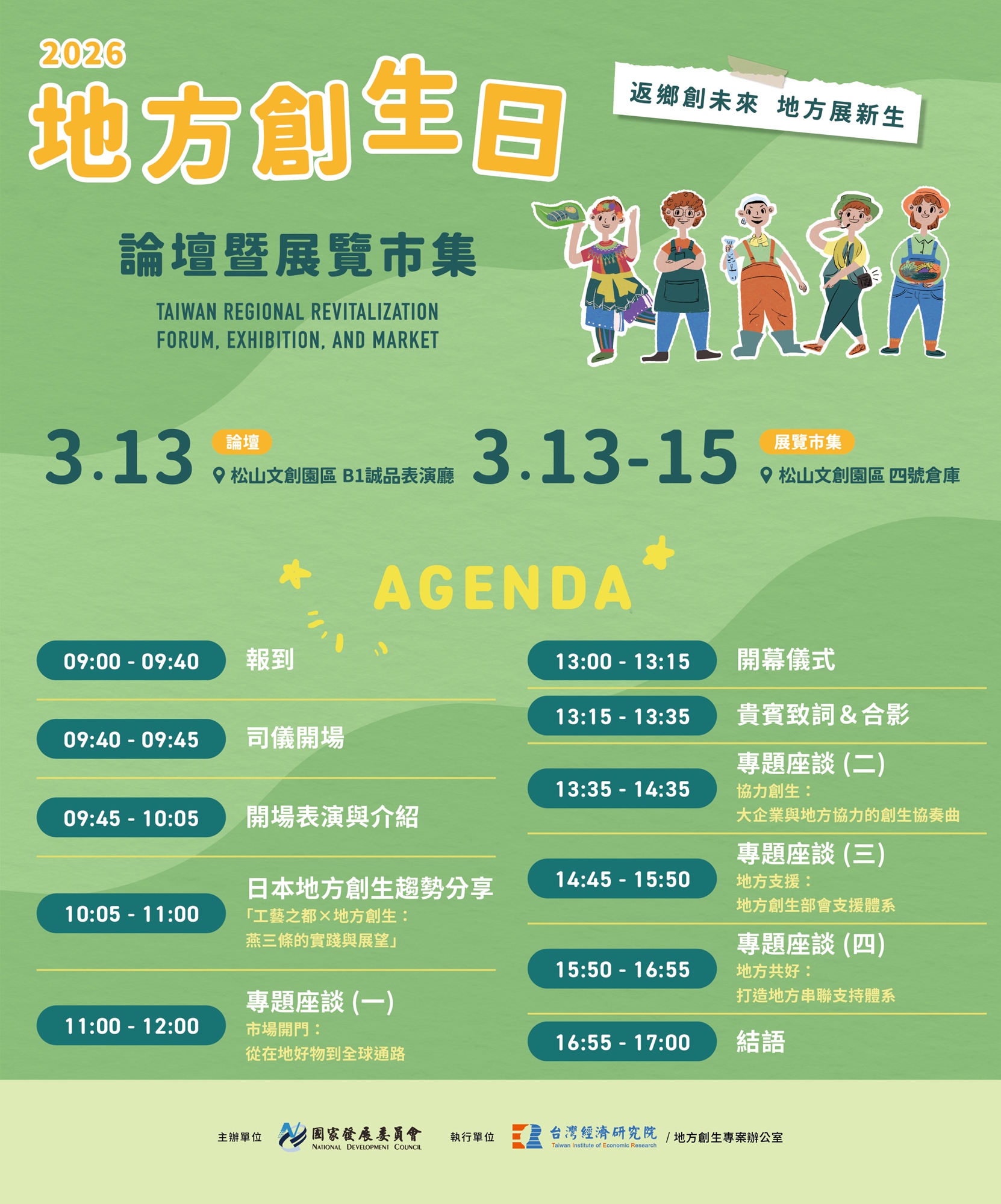 「2026 地方創生日─論壇暨展覽市集」將於 3月13日(三)至 3月15日(日)在松山文創園區舉行,以「返鄉創未來・地方展新生」為主軸,結合論壇、展覽與市集,邀請民眾在地方創生日這一天,親身感受來自全臺各地的創生行動與在地魅力。