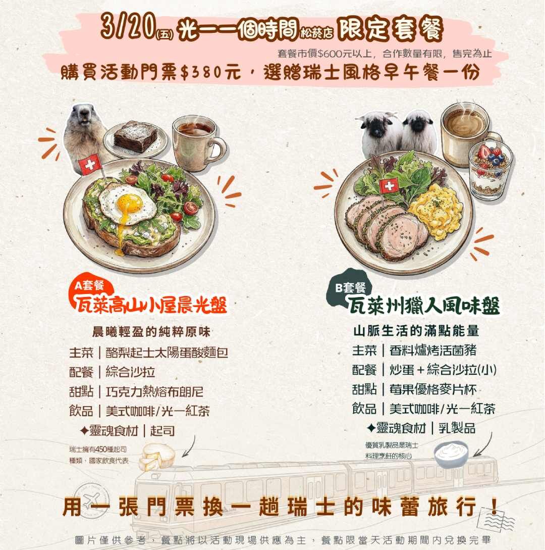 ★凡購買活動門票「可選贈瑞士風格早午餐一份」(原市價600元,門票價380元,限量40組,售完為止)