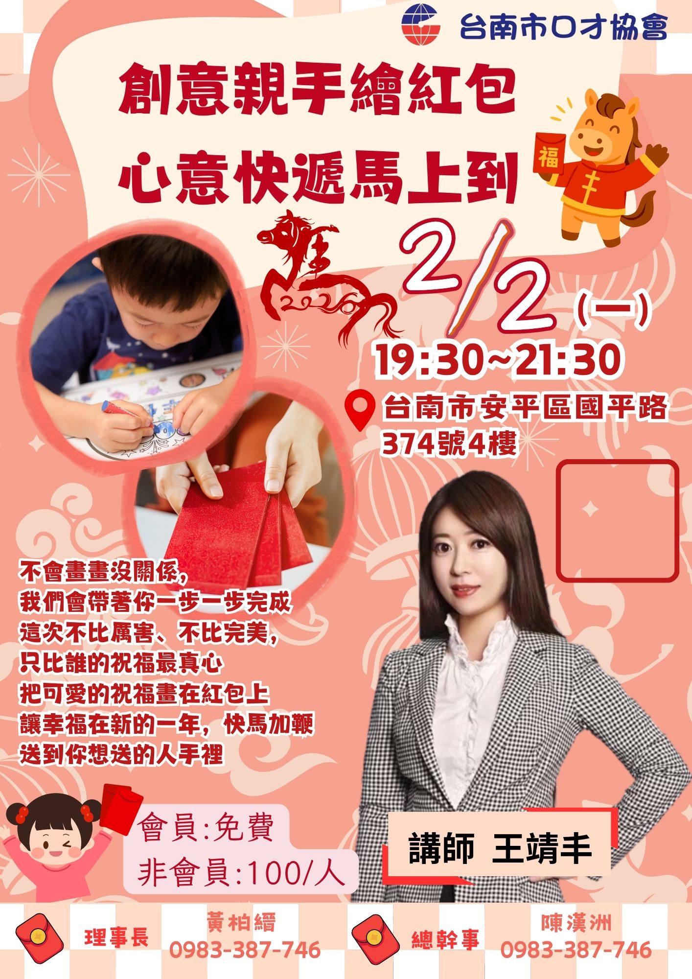 「創意親手繪紅包」是一場結合創意與祝福的手作活動,透過輕鬆有趣的繪畫方式,將心意畫進紅包中。講師將一步步引導完成,不追求技巧,只重視情感傳達。讓參與者在溫馨的創作過程中,感受手作溫度,為新的一年傳遞滿滿的祝福與好運。