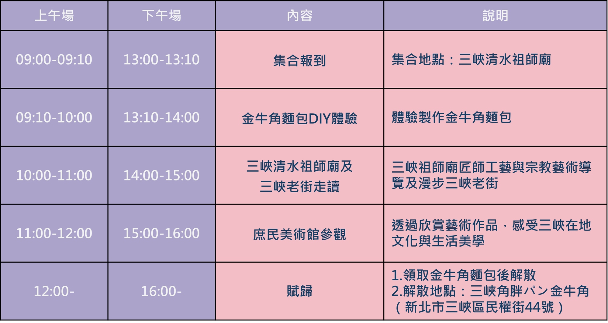 本次活動將親手揉製三峽經典美味金牛角麵包,走訪清水祖師廟欣賞雕刻工藝,沿著老街漫步至庶民美術館,在百年老宅中感受藝術與空間的對話,體驗歷史、藝術與美食交織的三角湧風情。