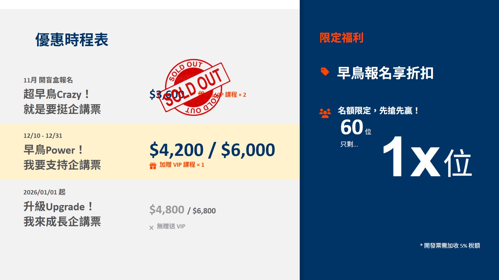 填寫2分鐘課前問卷,讓課程更貼近您的需求!您的回饋將提供給講師。