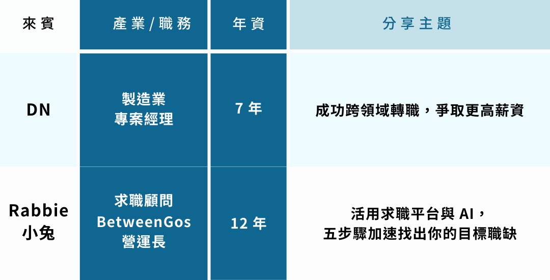 講座邀請到 2 位來賓,由成功從航運助理跨入科技業國外業務、製造業專案經理,爭取到更高薪資的學員 DN,以及擁有 10+ 年經驗、就業服務乙級證照的 BetweenGos 營運長/求職顧問 Rabbie,分享如何結合「成功轉型經驗」與「系統化工具」,並活用求職平台演算法縮小職缺範圍,在變動的求職市場中精準定位你的目標職缺。