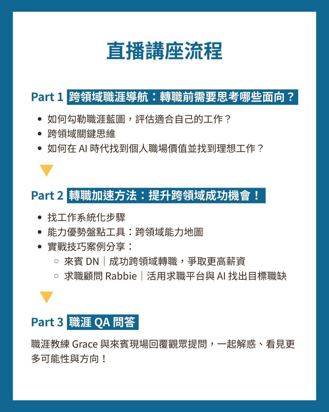 線上直播講座,更有 QA 問答環節,任何轉職煩惱,歡迎直接與教練 Grace、來賓互動,解惑你的疑問。