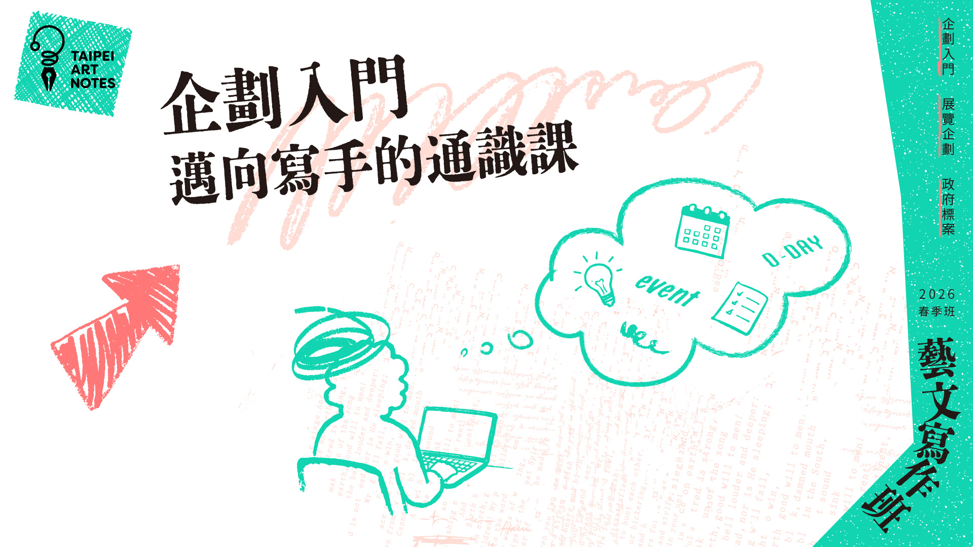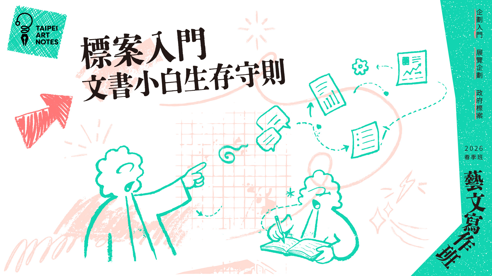 在臺灣藝文產業中,企劃撰寫、展覽實務與標案申請,是每一位藝文工作者遲早會面對的基本能力Taipei Art Notes 2026藝文寫作班所推出的三大入門課程,專為剛踏入產業的新人設計,從實務經驗出發,拆解實務困難與關鍵環節,透過「企劃入門—邁向寫手的通識課」、「展覽入門—新手友善工作指南」、「標案入門—文書小白生存守則」三大入門課,從邏輯思考、職場生態到文書製作,提供你最實用的自學建議。