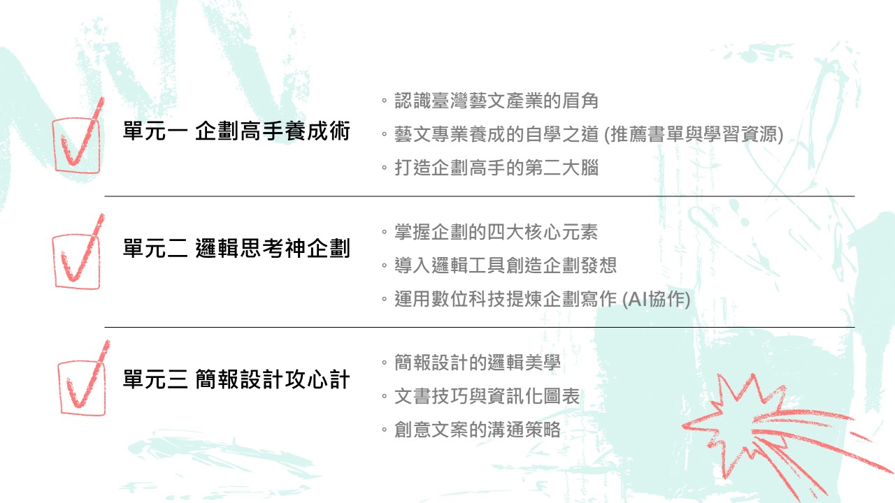 課程規劃以「專業養成」、「邏輯思考」、「簡報設計」三大面向,簡介台灣藝文產業,以及企劃人才需要具備的職能,並提供相關的學習資源與閱讀書單。