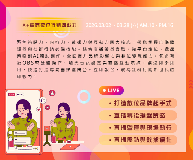 我們深刻理解您對科技的陌生與對未來的焦慮。因此,本課程剝除複雜理論,直指核心,教授當前就業市場最急需的 「直播電商幕後」 與 「AI辦公智能」 兩大實戰技能。您無需露臉、不拚年輕,只需運用您寶貴的經驗,加上我們系統化的訓練,化身為企業爭搶的數位轉型人才,自信開啟職涯第二春。