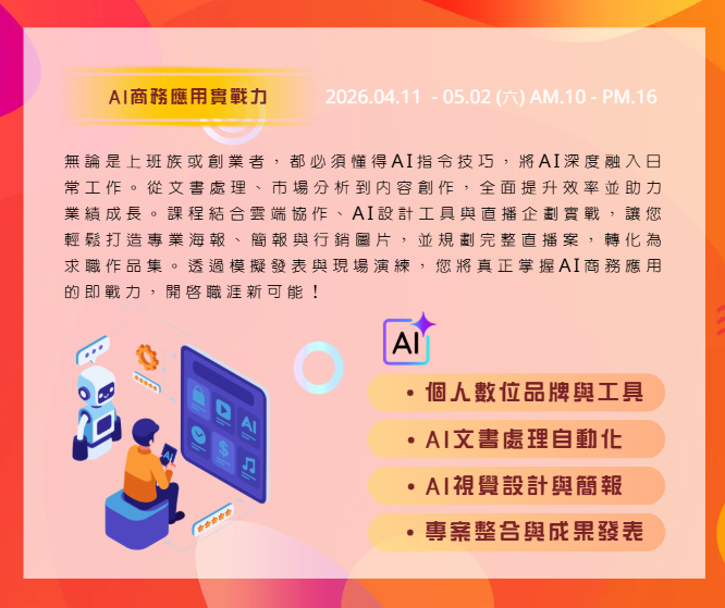 不只學AI概念,更是將AI工具深度融入文書處理、市場分析、內容創作等日常工作,成為您的智能助理,工作效率倍增。🎯 實戰作品導向: