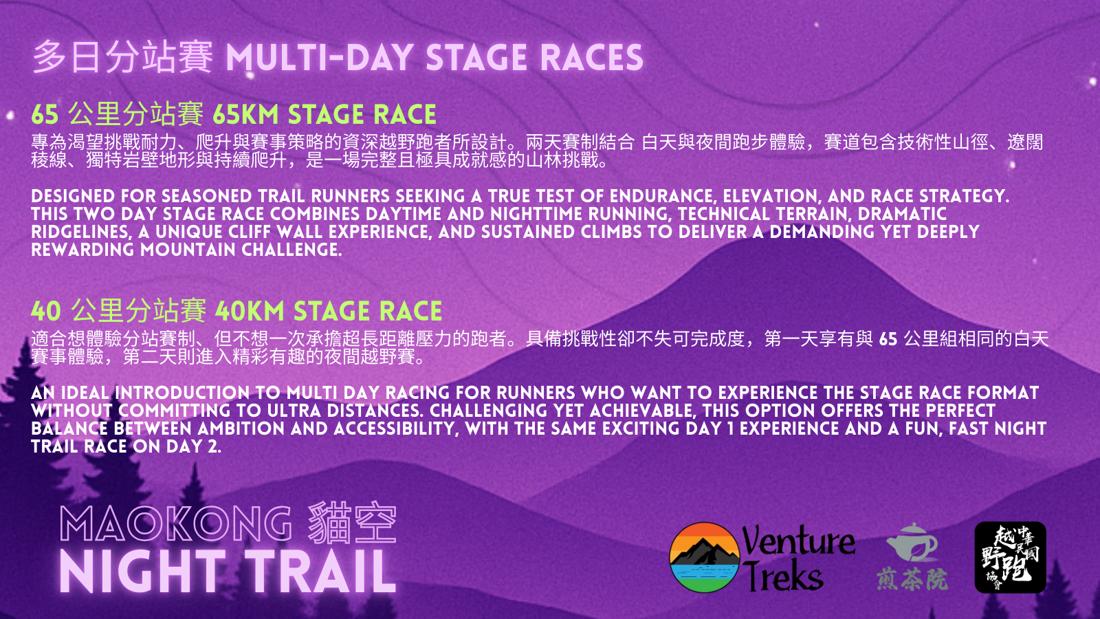 賽事首日為 白天賽事(限分站賽選手),第二天則為 夜間越野賽,不論是挑戰分站賽的進階跑者,或是只想體驗夜跑魅力的單日參賽者,都能找到屬於自己的舞台。