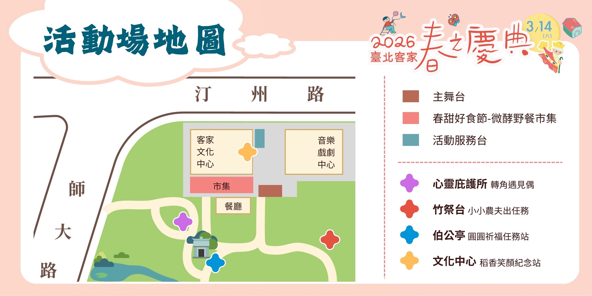 【活動資訊】 活動日期:3/14(六) 活動費用:每組收費450元 (每組1位小朋友陪同家長最多2位) 活動內容:新丁新枝祈福儀式13:30-14:30、闖關遊戲14:30-17:00(附贈闖關禮包) 建議年齡:3歲(含)以上,歡迎闔家報名 報到時間:13:00至13:30前於活動服務台報到並領取禮包 報到地址:客家文化主題公園(臺北市中正區汀州路三段2號) |