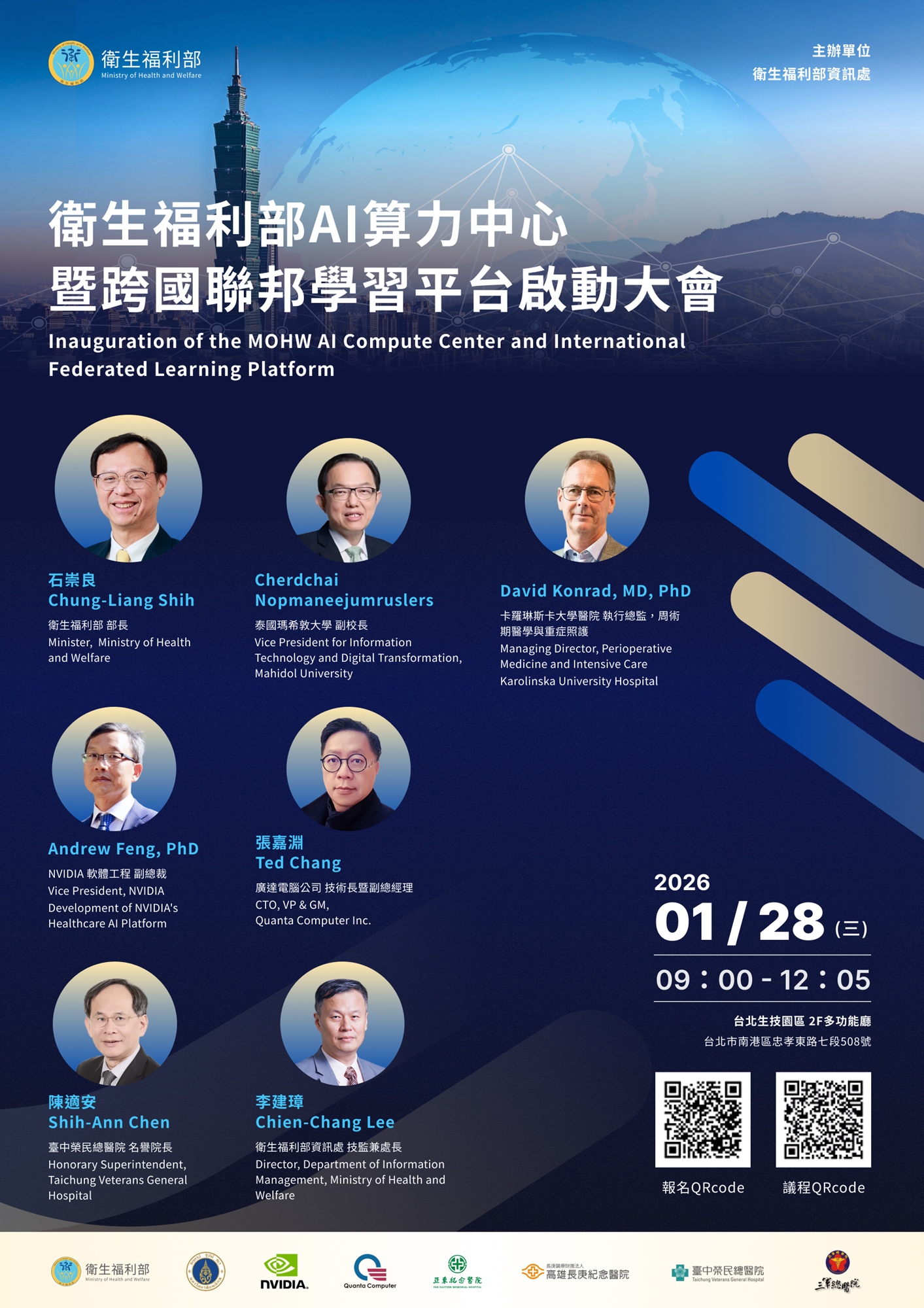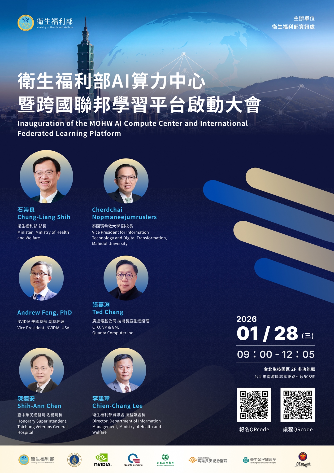 本次啟動大會,除宣布「衛福部高算力中心」啟用外,也將宣布推動衛福部資訊處規劃之跨國聯邦學習技術的跨院驗證環境,以克服人工智慧醫療模型在臨床落地時的實務難題,也藉由跨國合作模式,提升國際能見度。