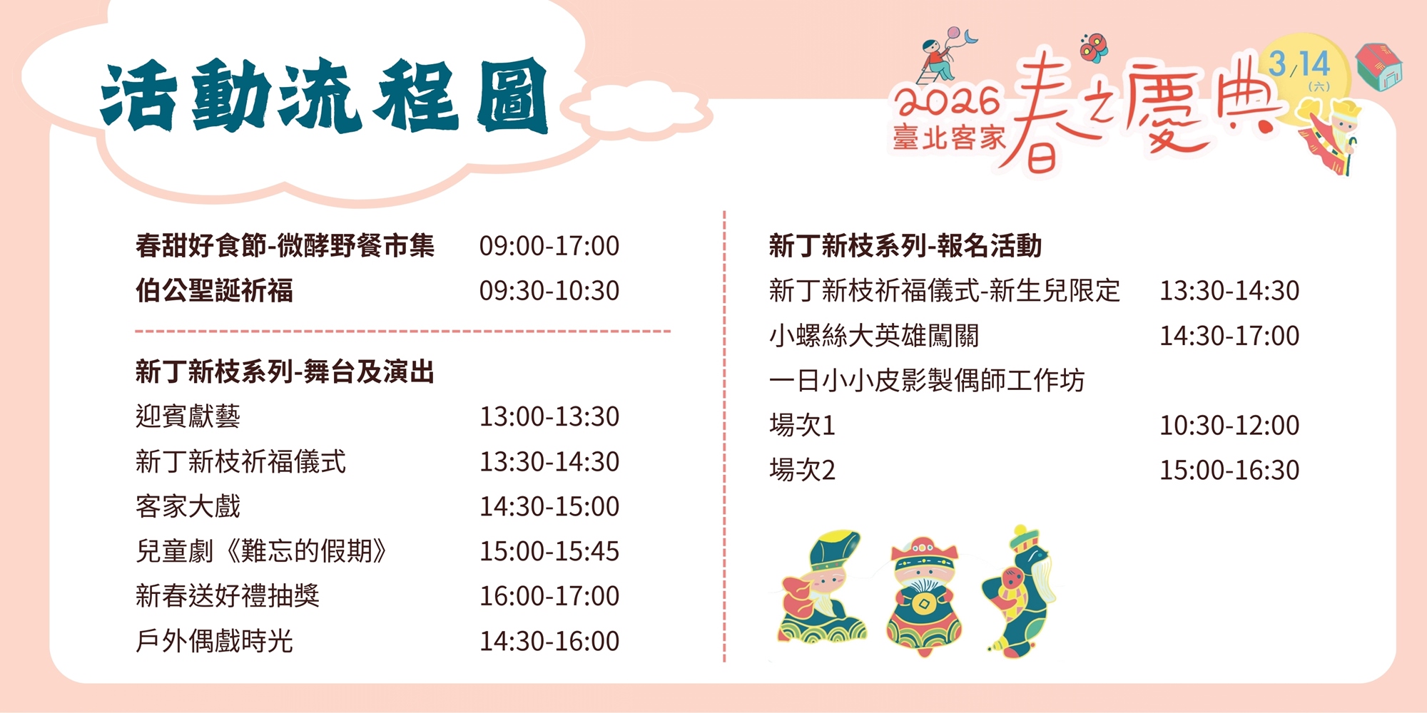 【活動資訊】 活動日期:3/14(六) 活動費用:每組收費200元 (每組限1位寶寶+最多2位陪同家長上台參與儀式,其餘家人可於現場周邊觀禮,感謝您的體諒與配合) 活動內容:與主祭官一同上台參加新丁新枝祈福儀式13:30-14:30(附贈祈福禮包) 報名資格:活動當日未滿1歲之嬰幼兒(2025/3/14 後出生) 報到時間:13:00至13:30前於活動服務台報到並領取禮包 報到地址:客家文化主題公園(臺北市中正區汀州路三段2號) |