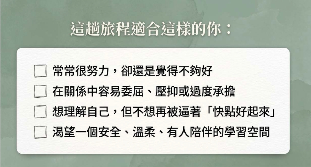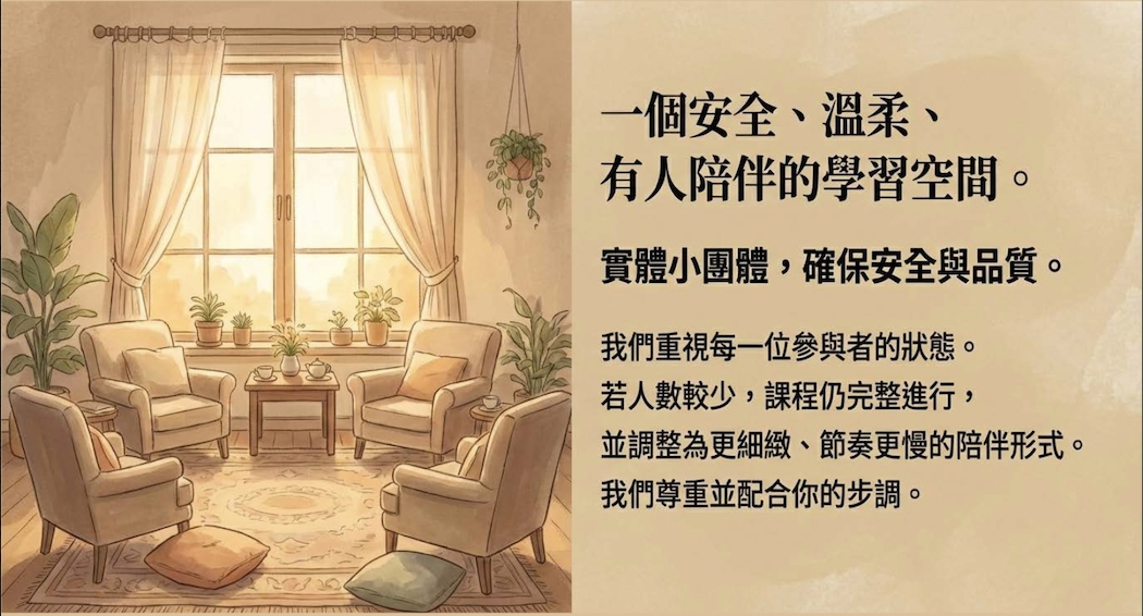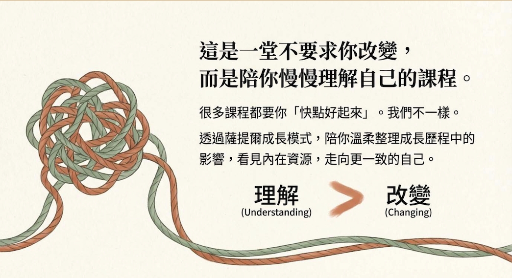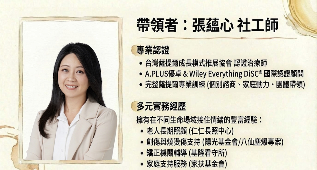 🎯薩提爾成長模式學習歷程台灣薩提爾模式個別諮商專業訓練認證(2017-2019)薩提爾模式進階專業訓練-薩提爾團體與工作坊帶領人訓練認證(2021-2023)2023 年度薩提爾模式個別諮商督導訓練結業(2023-2024)2024 薩提爾模式進階訓練-家庭重塑導引者訓練(2024-2025)薩提爾模式家庭動力與處遇評估專業訓練(2024-2026)擔任薩提爾協會、旭立基金會工作坊小組導師超過100場
