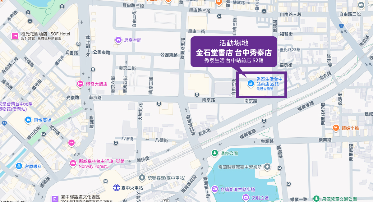 - 地 點|台中市東區南京路66號2F [秀泰生活 台中站前店 S2館]