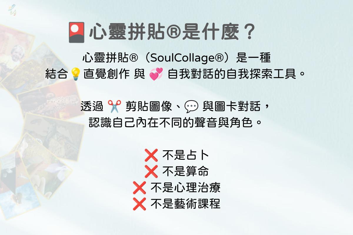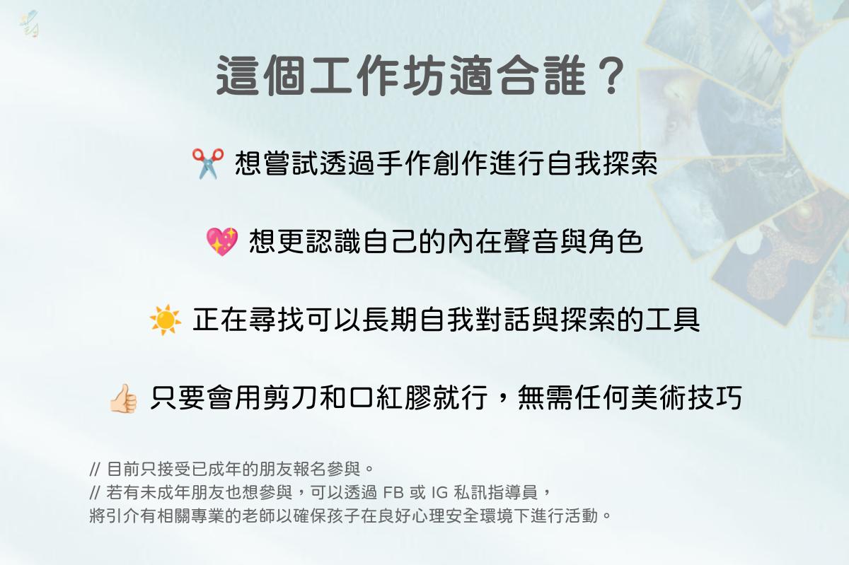 ☺︎ 本活動為心靈拼貼®初體驗工作坊,屬於自我探索與手作體驗性質之活動。