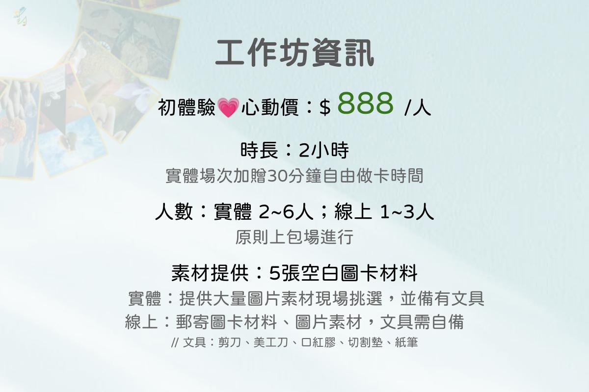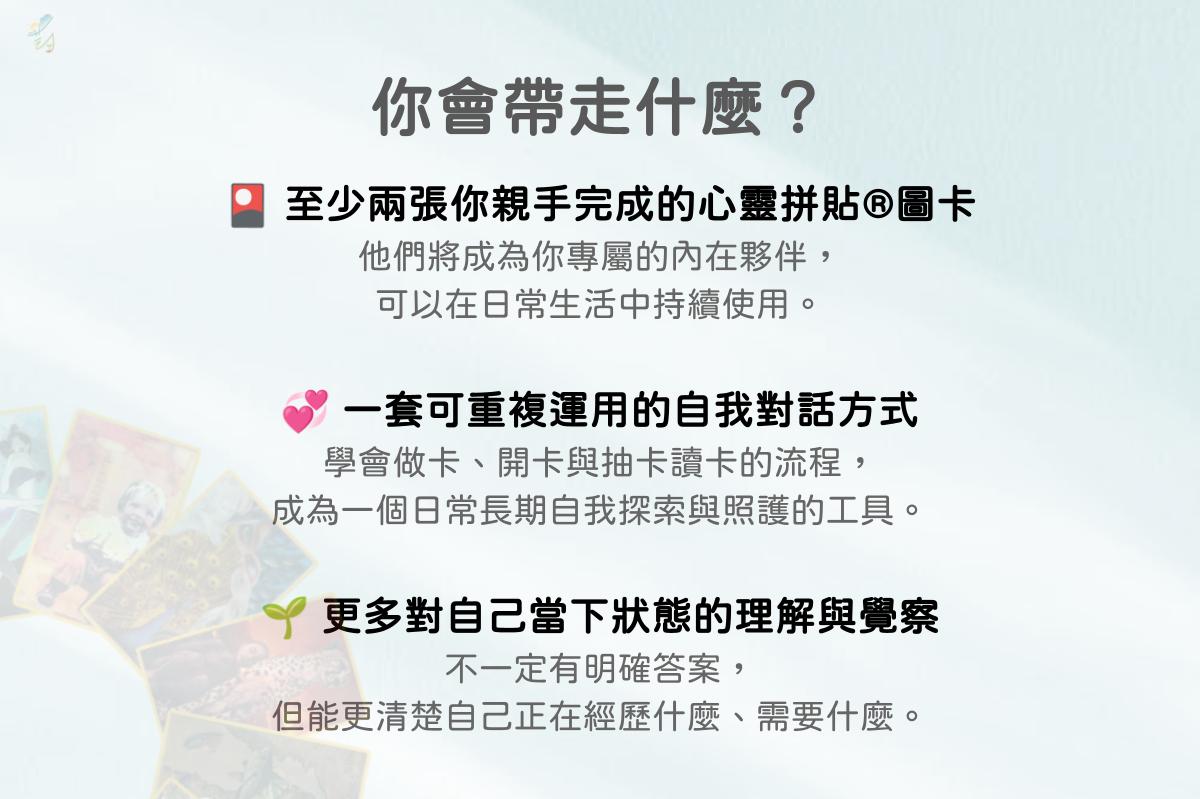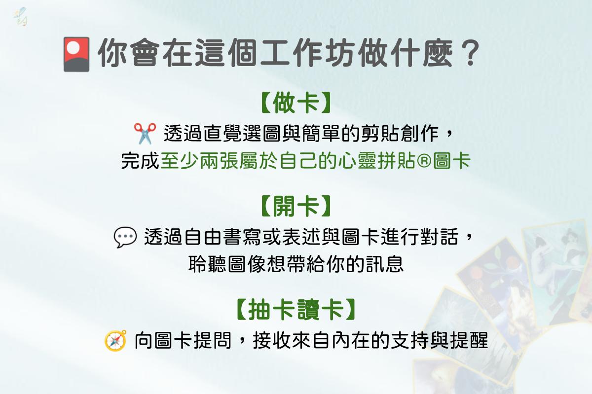 初體驗工作坊主要適合 還未體驗過心靈拼貼® 做卡 → 開卡 → 抽卡讀卡 的新朋友。