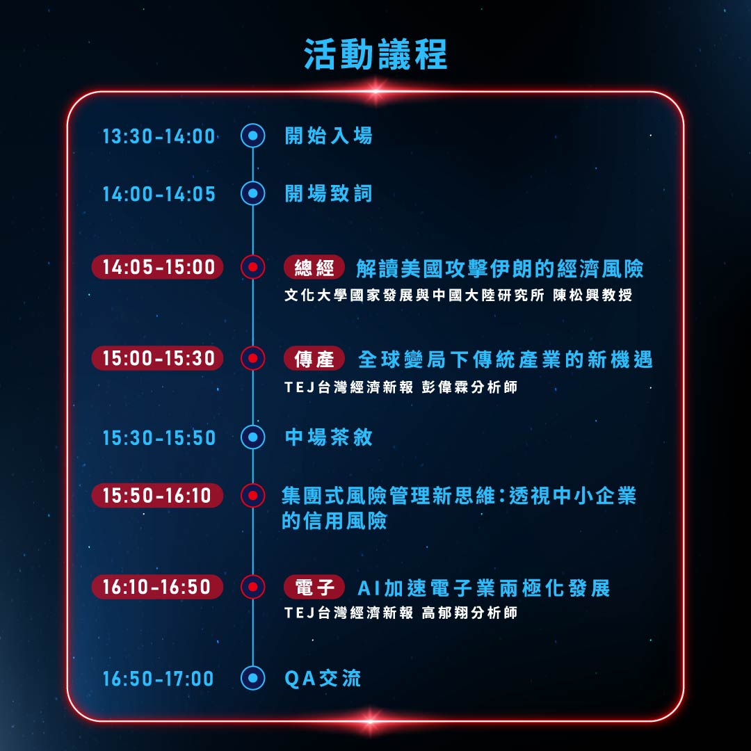 ⭐「TEJ 2026年產業展望講座」登場⭐ 探尋地緣政治與AI浪潮下的關鍵新局!面對全球政經重組格局,2026年產業正經歷結構性變革,您準備好了嗎? 本場講座將解析📍傳統產業的困境與因應趨勢、📍AI發展使電子產業發展兩極化,以及📍國際情勢緊張下供應鏈安全及國防航太的新成長動能。TEJ產業研究團隊,從總經、信評、產業角度協助掌握市場動態、辨識信用風險,在動盪環境中踏穩 2026 產業未來!