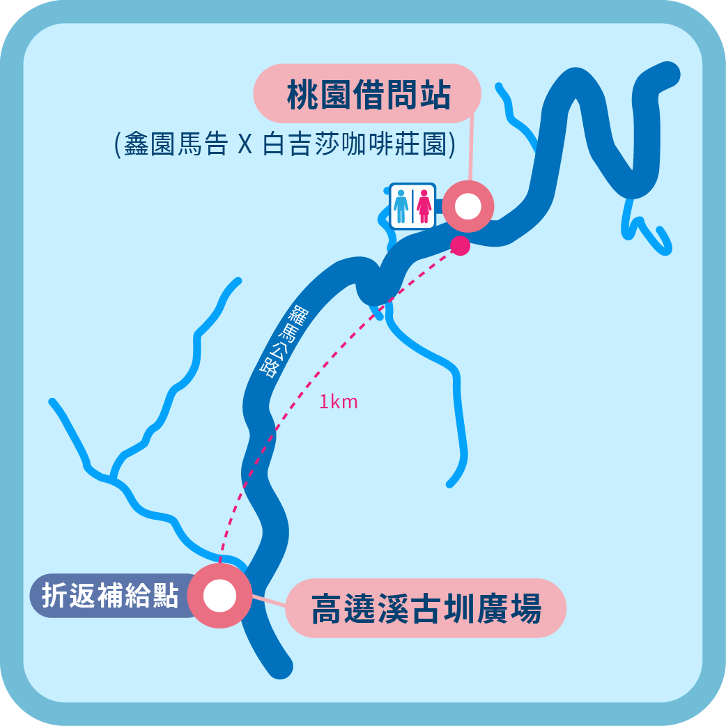 - 高遶溪古圳廣場折返補給點前:桃園借問站|鑫園馬告 X 白吉莎咖啡莊園(桃園市復興區羅馬路六段36號)
