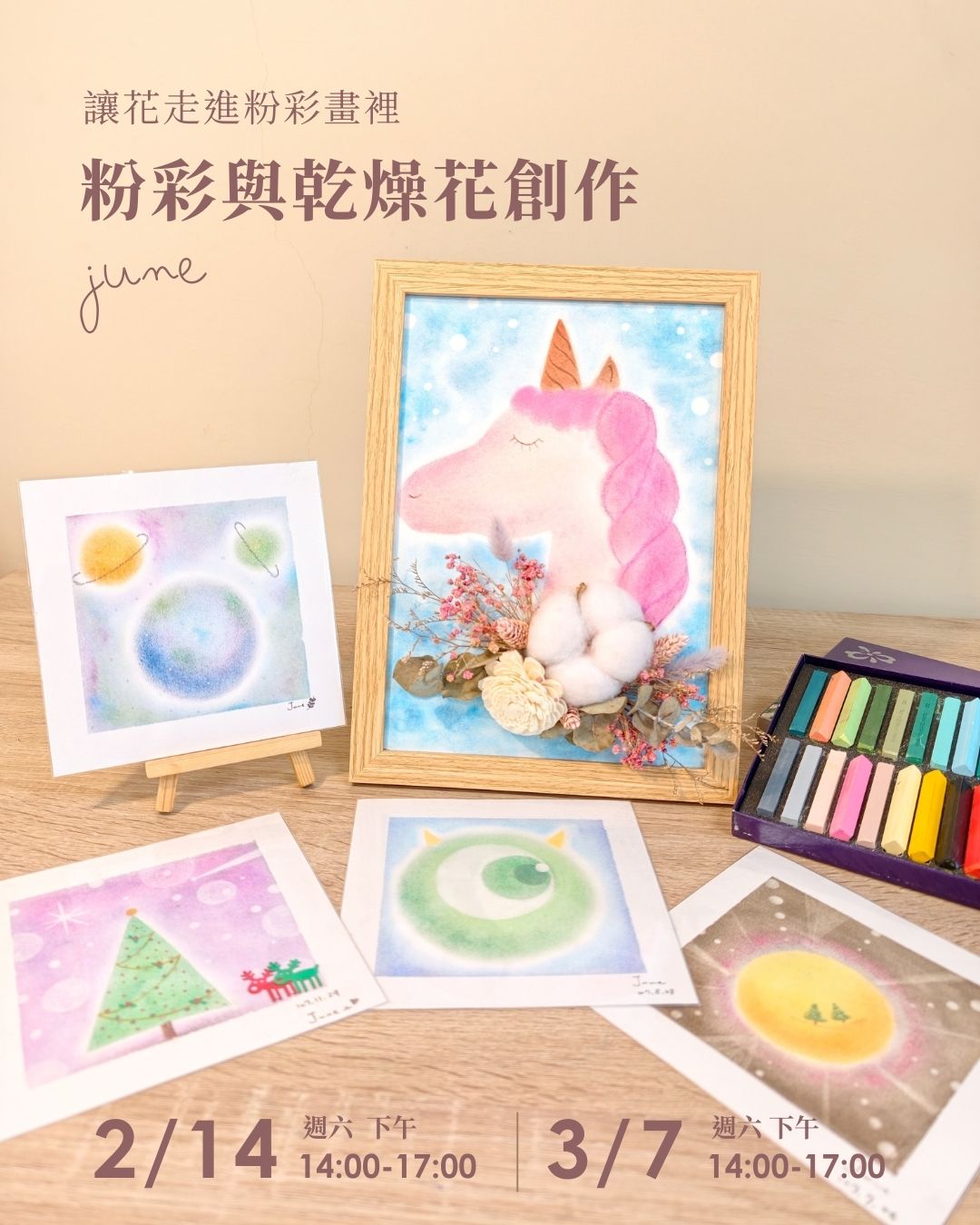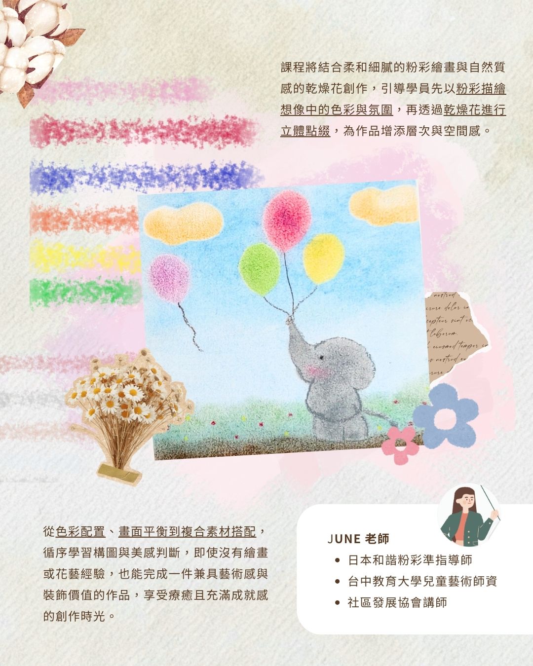 課程將結合柔和細膩的粉彩繪畫與自然質感的乾燥花創作,引導學員先以粉彩描繪想像中的色彩與氛圍,再透過乾燥花進行立體點綴,為作品增添層次與空間感。