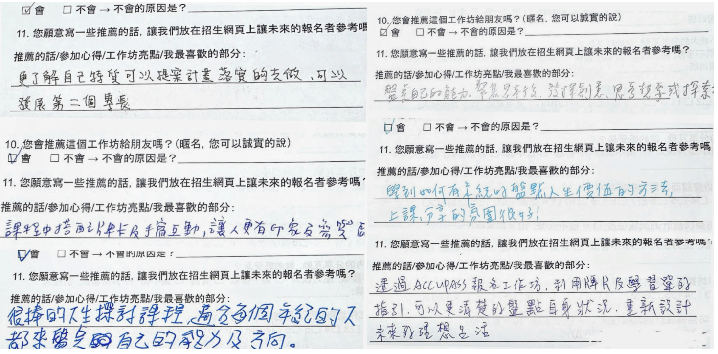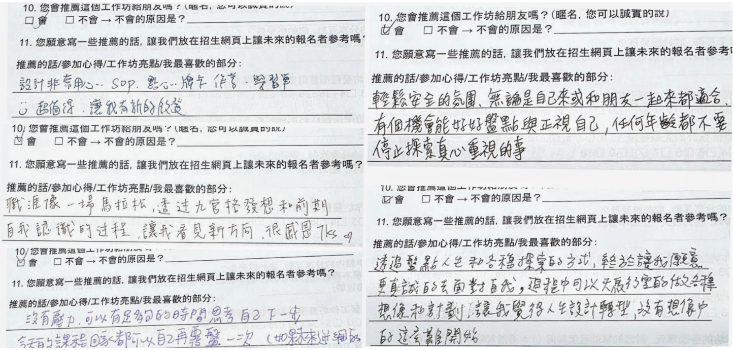 “設計人生行動計畫的課程, 內容很有趣, 也很燒腦的探索, 看到不同面的自我, 為新的下一步找到更適合的方向 , 很推薦來上課唷~”