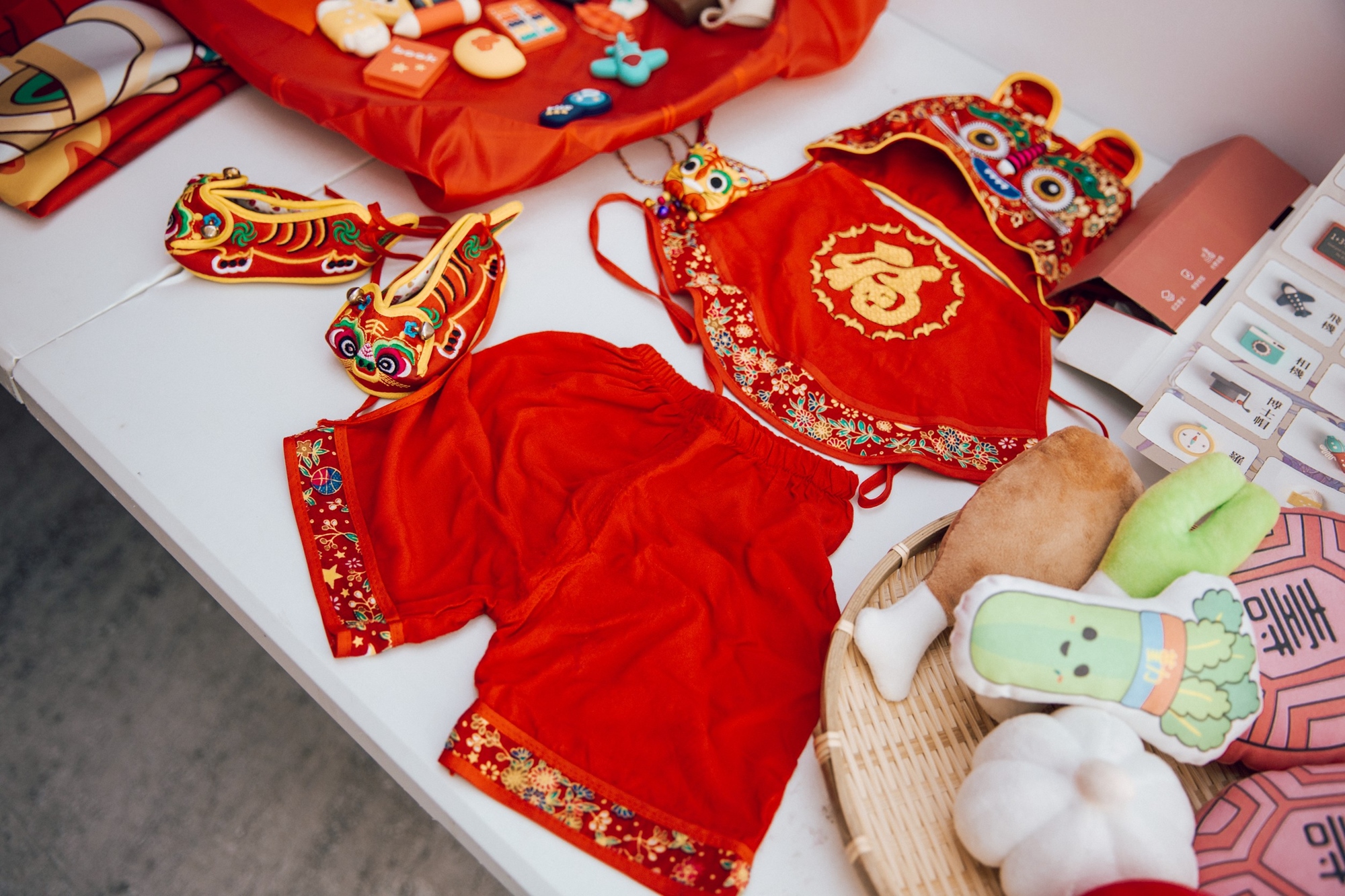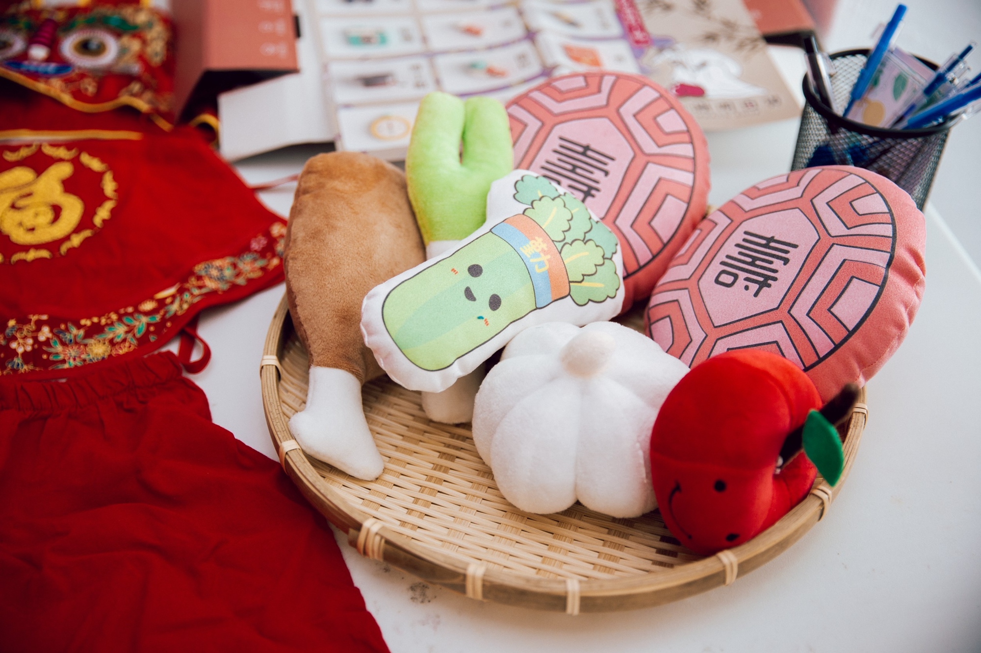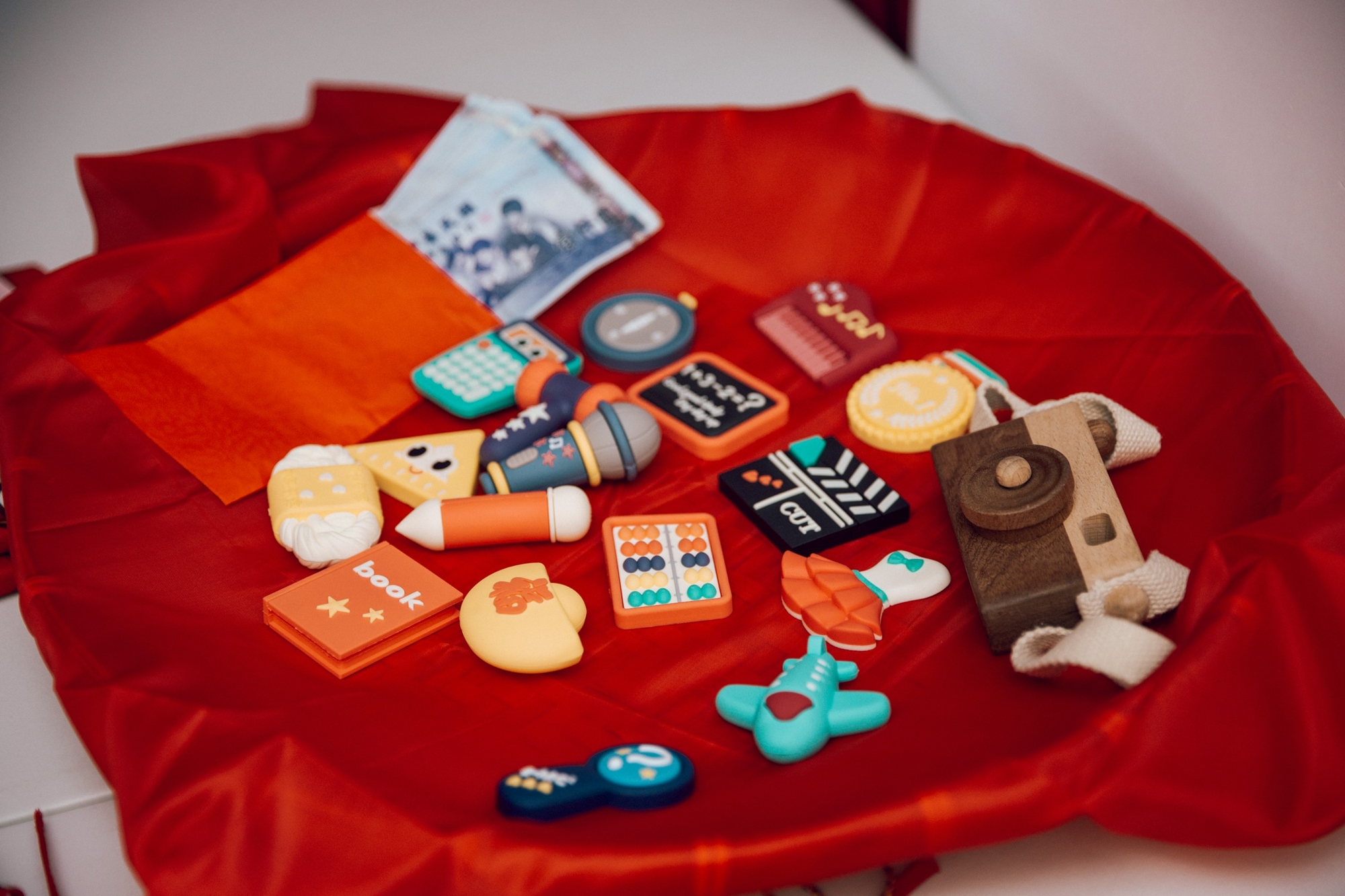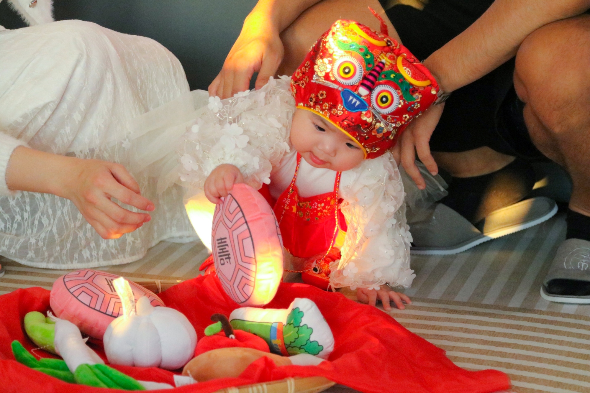 將象徵「賢良方正、吉祥如意」的紅布鋪好,接著再把象徵「八面圓通、知圓行方」的米篩放置在紅布之上,擺上道具讓寶寶任意抓取3樣道具。