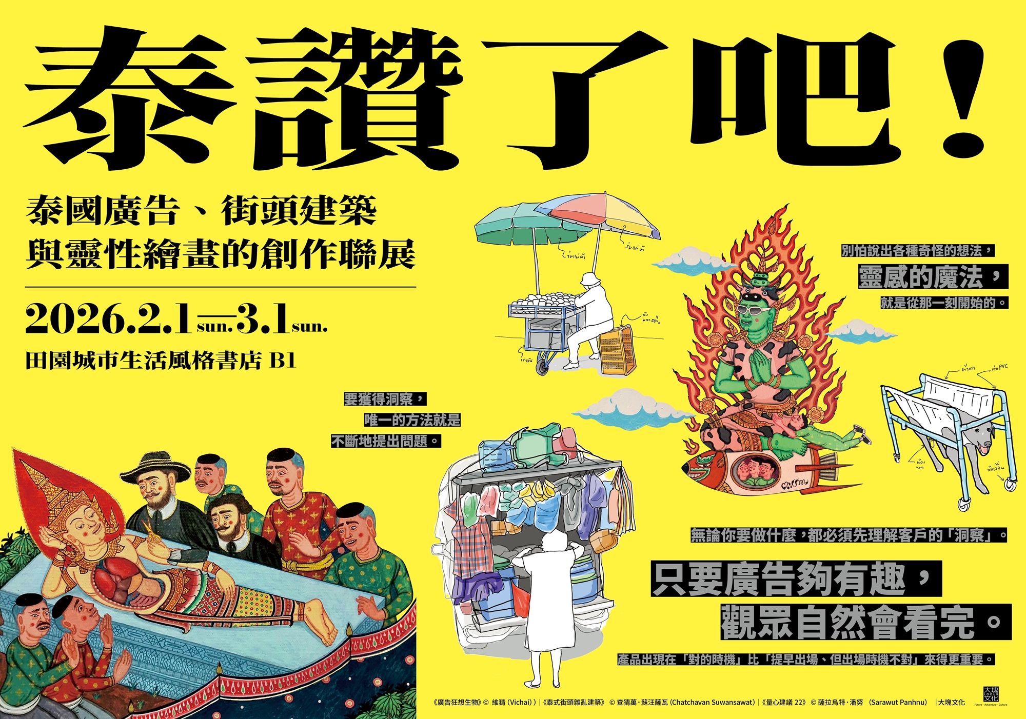 這三種創作形式分別來自不同領域,卻同時指向泰國文化最核心的特質:混雜、彈性與高度生命力。無論是廣告中的敘事張力、街頭建築所展現的即興智慧,或是靈性繪畫裡信仰與流行文化的並置,皆源自對日常生活的敏銳觀察,以及將現實經驗轉化為美學表現的能力。透過設計、藝術與視覺文化的視角,我們希望觀眾能看見泰國如何把日常轉化為創意,將文化的混雜性形塑為獨特風格,並凝聚為充滿活力的當代美學力量。