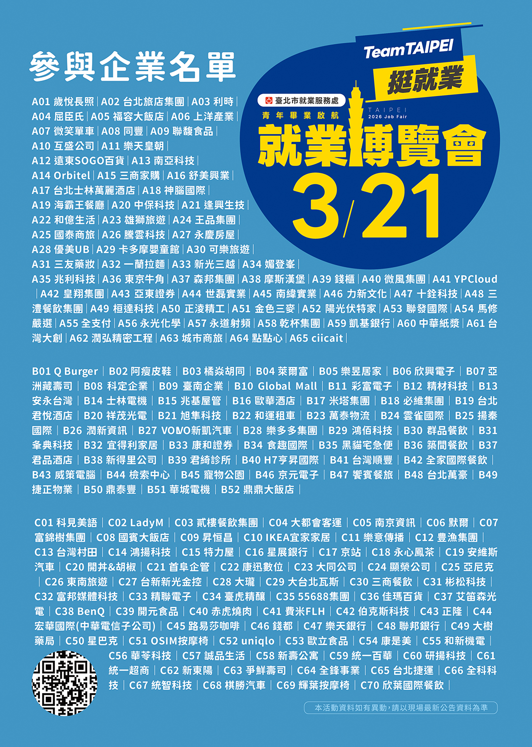 ※僅供參考,請依活動現場公告為準。若需詳細職缺內容,請至活動網頁查詢。