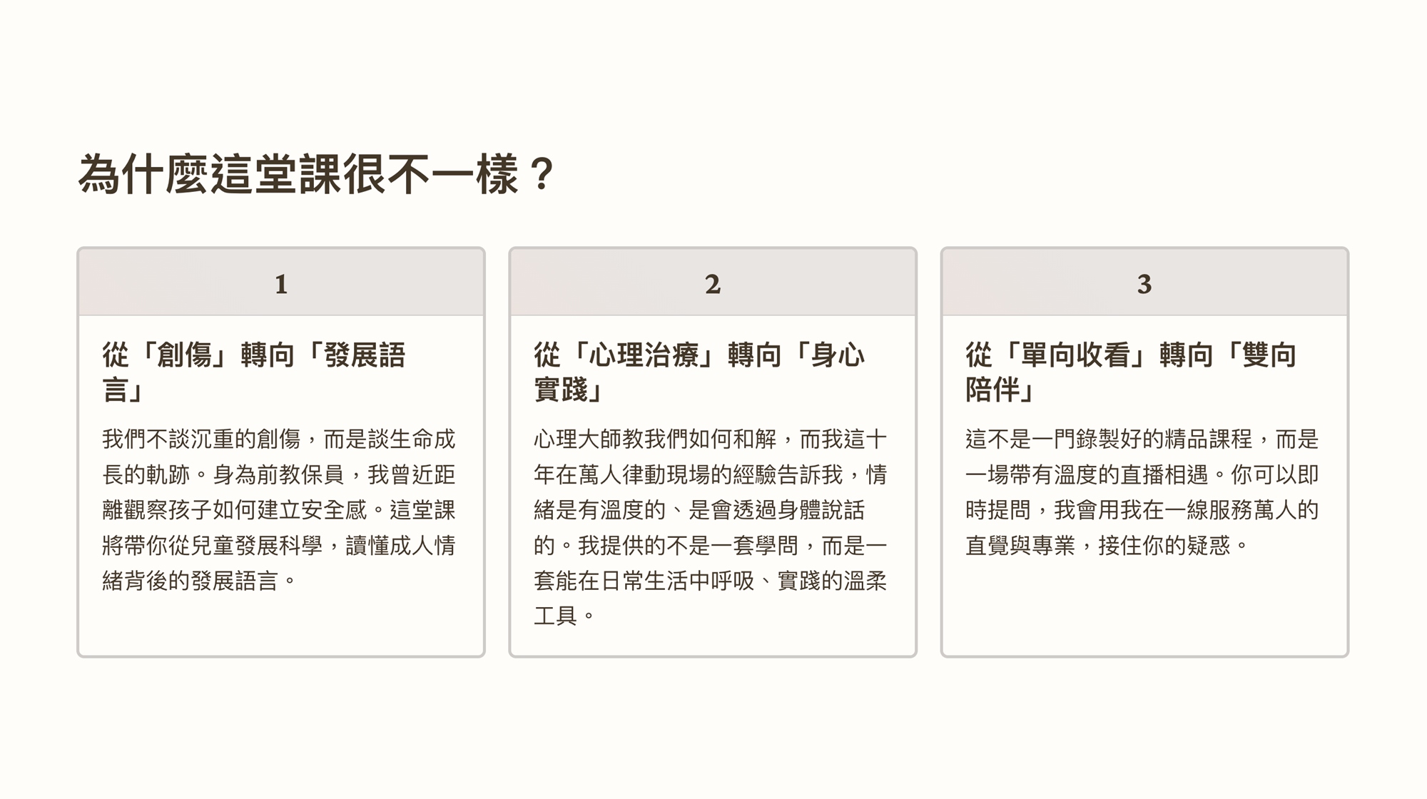 3 年兒童發展實務: 曾任職於專業親子館,第一線觀察幼兒如何建立安全感。這讓她能從「兒童發展科學」的源頭,精準解碼成人在壓力下的慣性反應。
