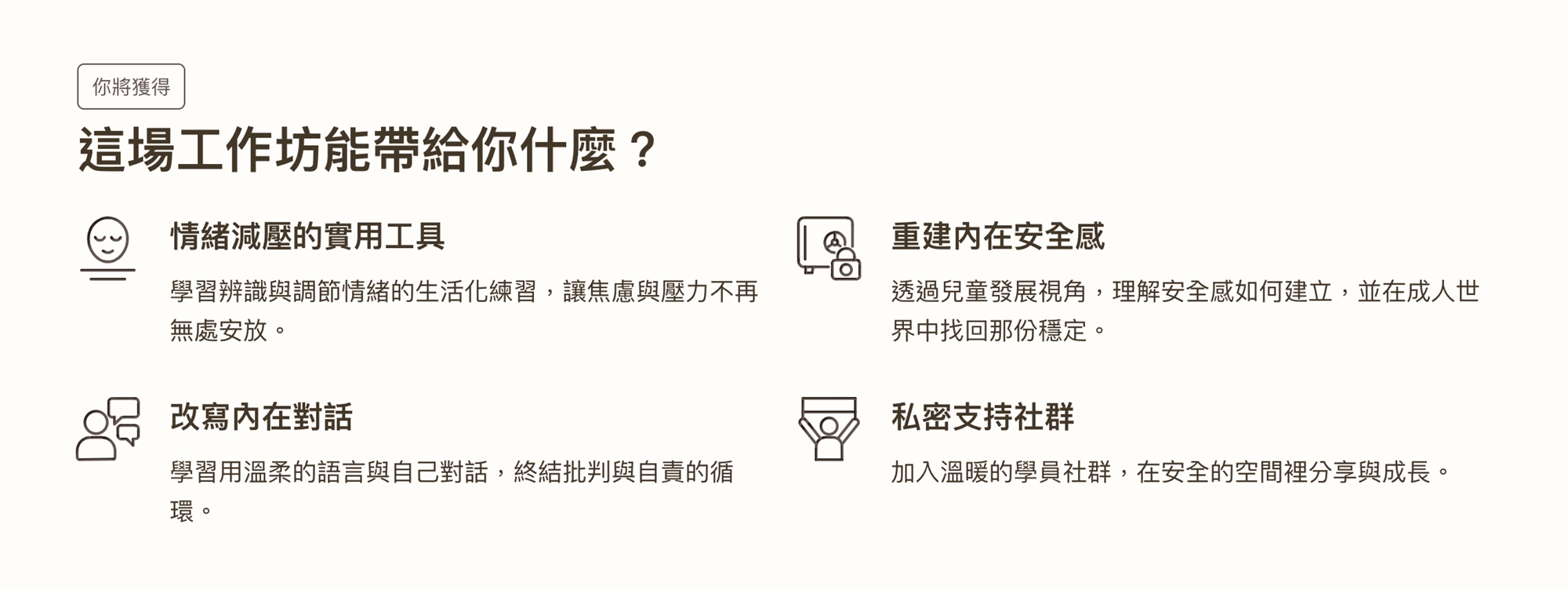 【課後陪伴系統】:完課後將邀請進入私密練習社群,這是一段長期、安全且不被評判的同行。