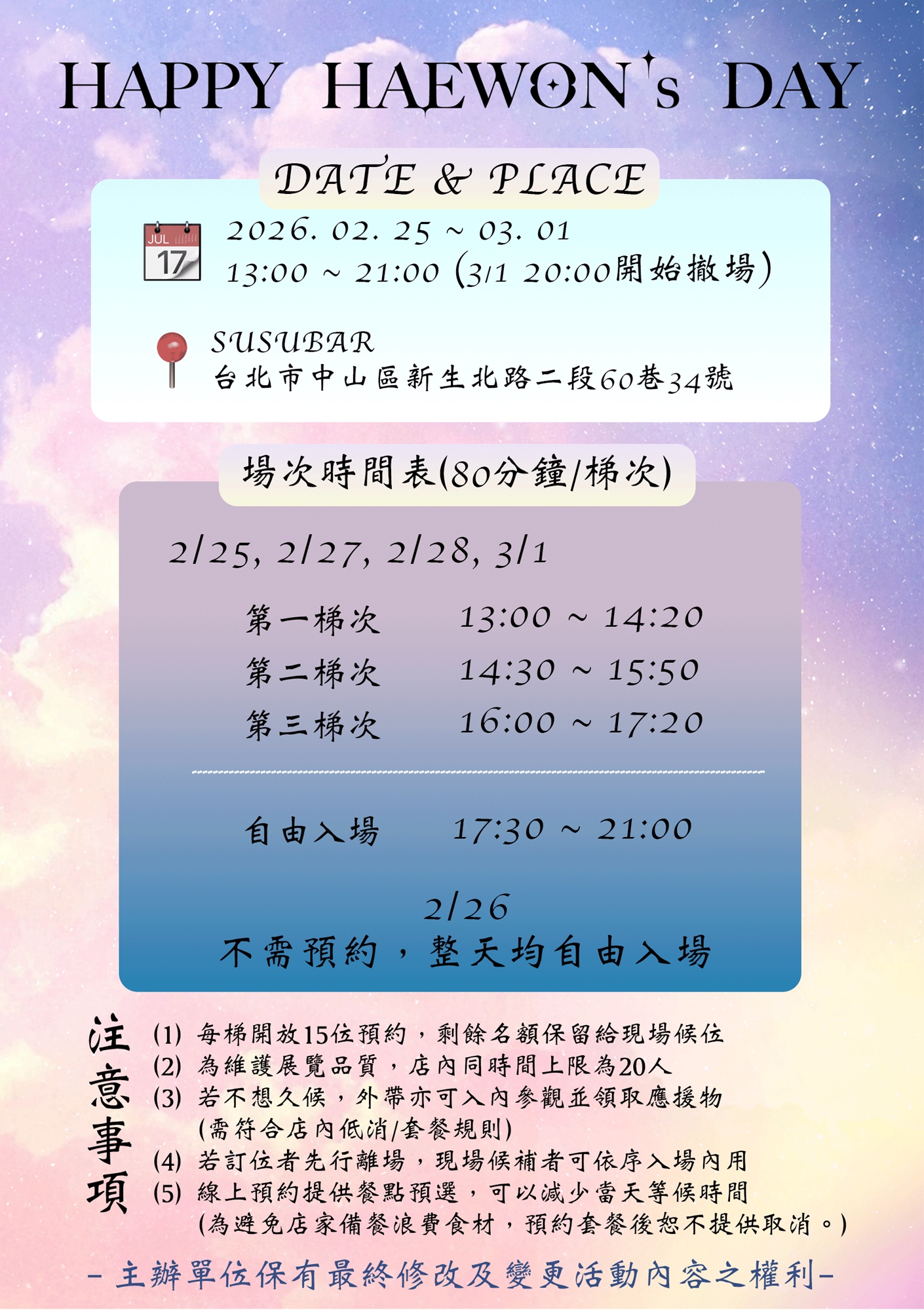 📆 日期:2/25(三) ~ 3/1(日)