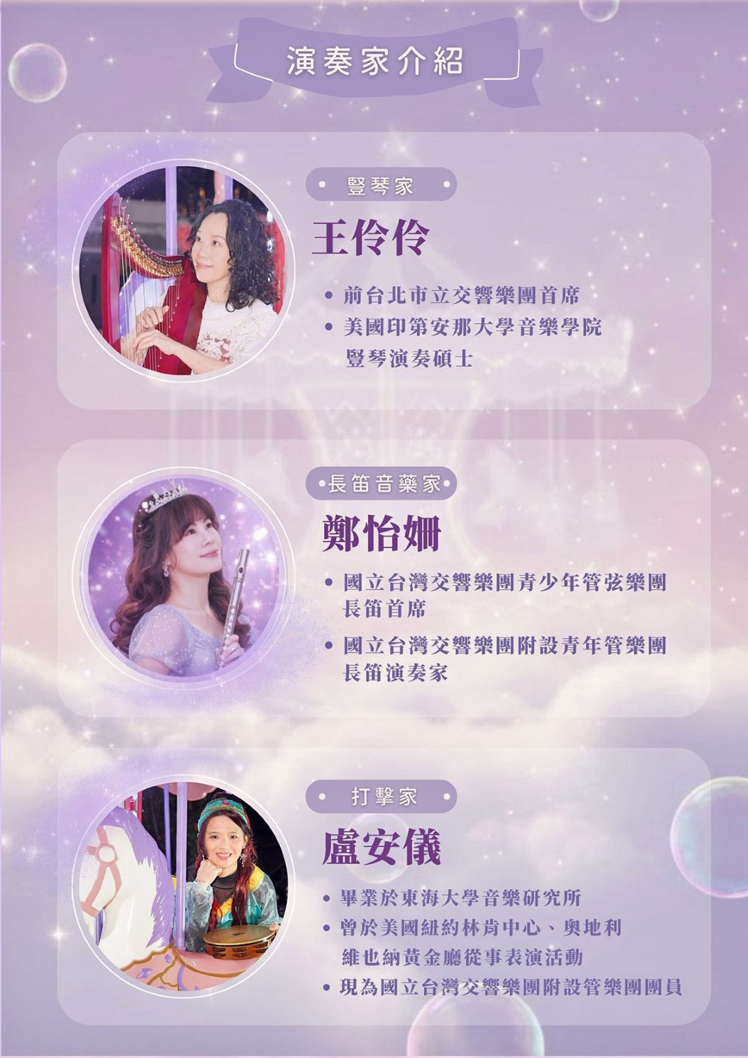本次音樂會邀請 美國印第安那大學音樂學院碩士學位 豎琴演奏家 王伶伶、國立臺灣交響樂青少年管絃樂團長笛首席 鄭怡姍 及曾於美國紐約林肯中心演出的打擊家 盧安儀共同演出