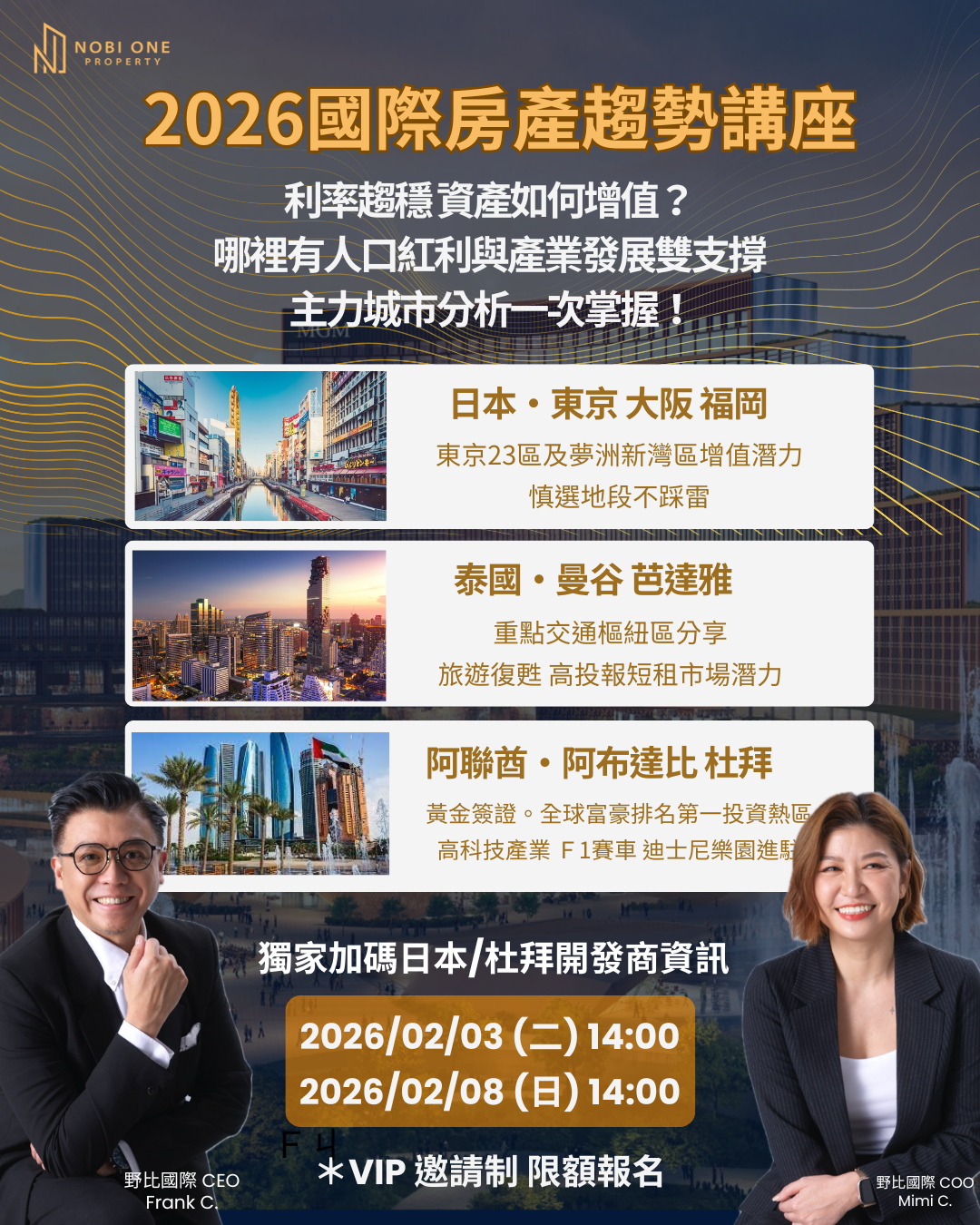 這是一場VIP邀請制的獨家講座,現場將加碼分享「日本/杜拜」一線開發商的未公開資訊。